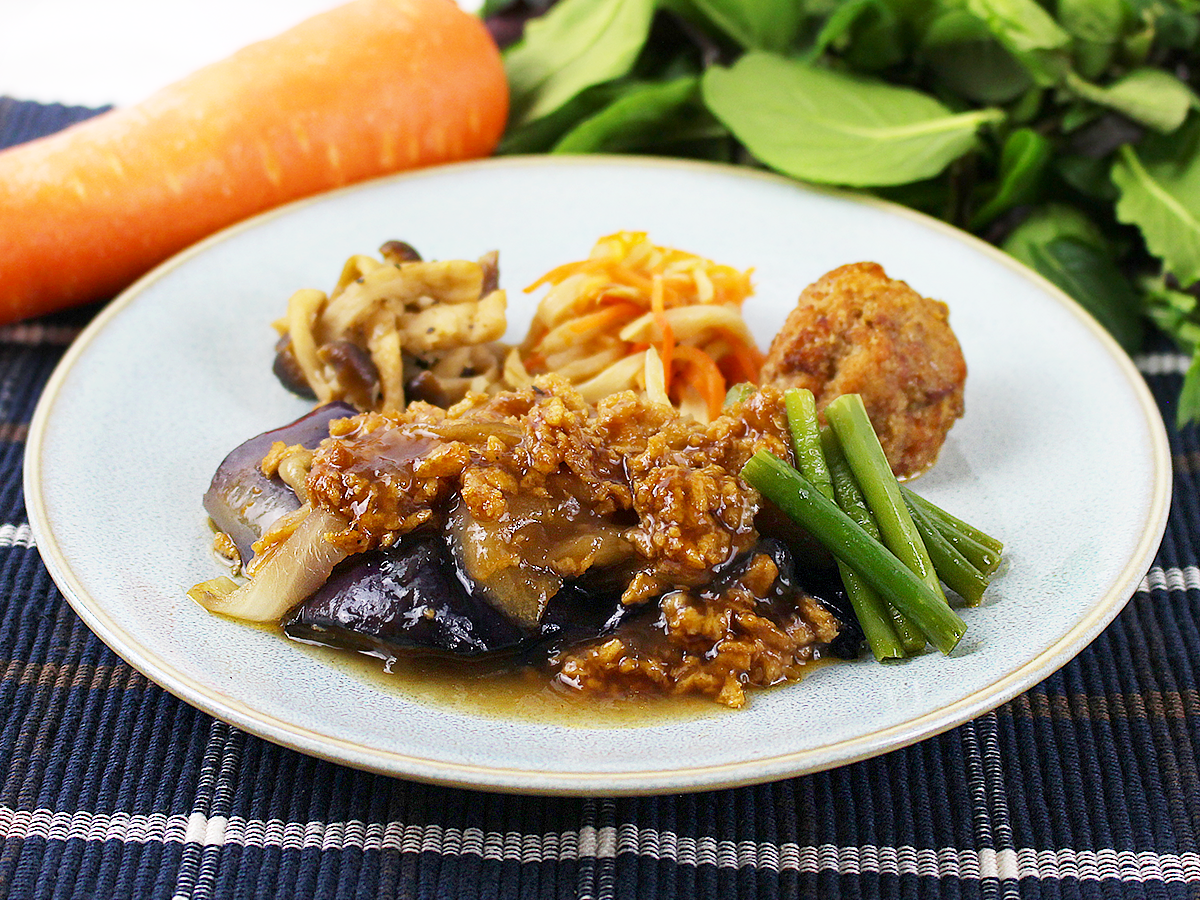 茄子がメインとなったベジプレートをご用意しました。お肉のミンチではなく、大豆ミートを使用することで脂っこいしつこさがなくさっぱりとした舌ざわりとなっております。味付けはナッシュオリジナルの黒酢あんにアクセントとなる山椒がガツっと効いています。