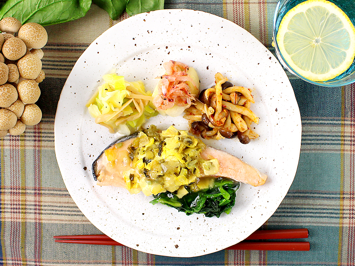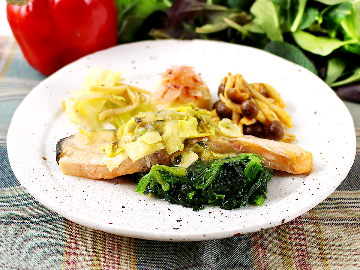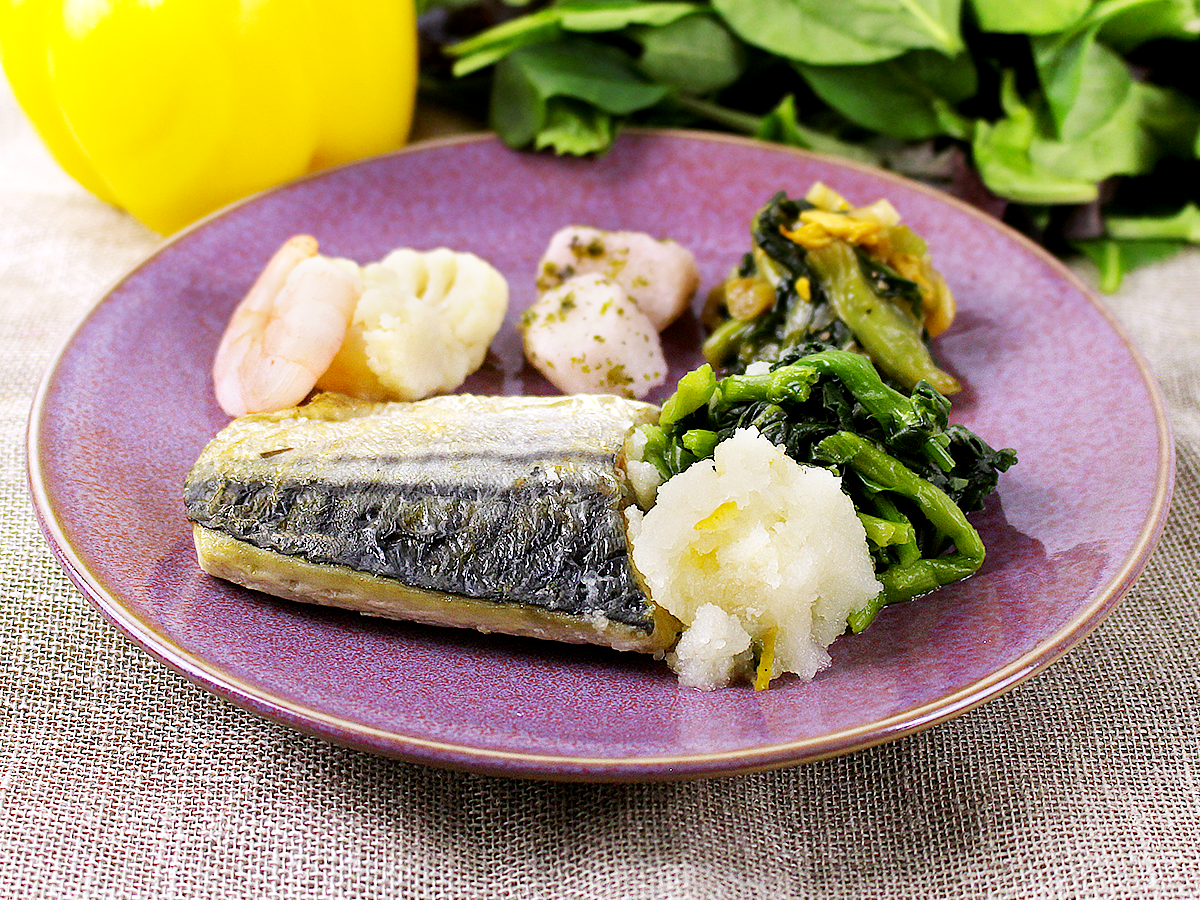 和食の定番であるさばの塩焼きに大根おろし、菜の花を添えてあっさりとしたプレートをご用意しました。大根おろしには国産のきざみ柚子を混ぜており、さっぱりとお召し上がりいただけます。さばは体内で合成できない必須脂肪酸であるDHAやEPAなどが豊富で、良質なたんぱく質も含まれています。また大根には様々な消化酵素が含まれており、魚のたんぱく質や脂質の消化を助ける働きがあります。