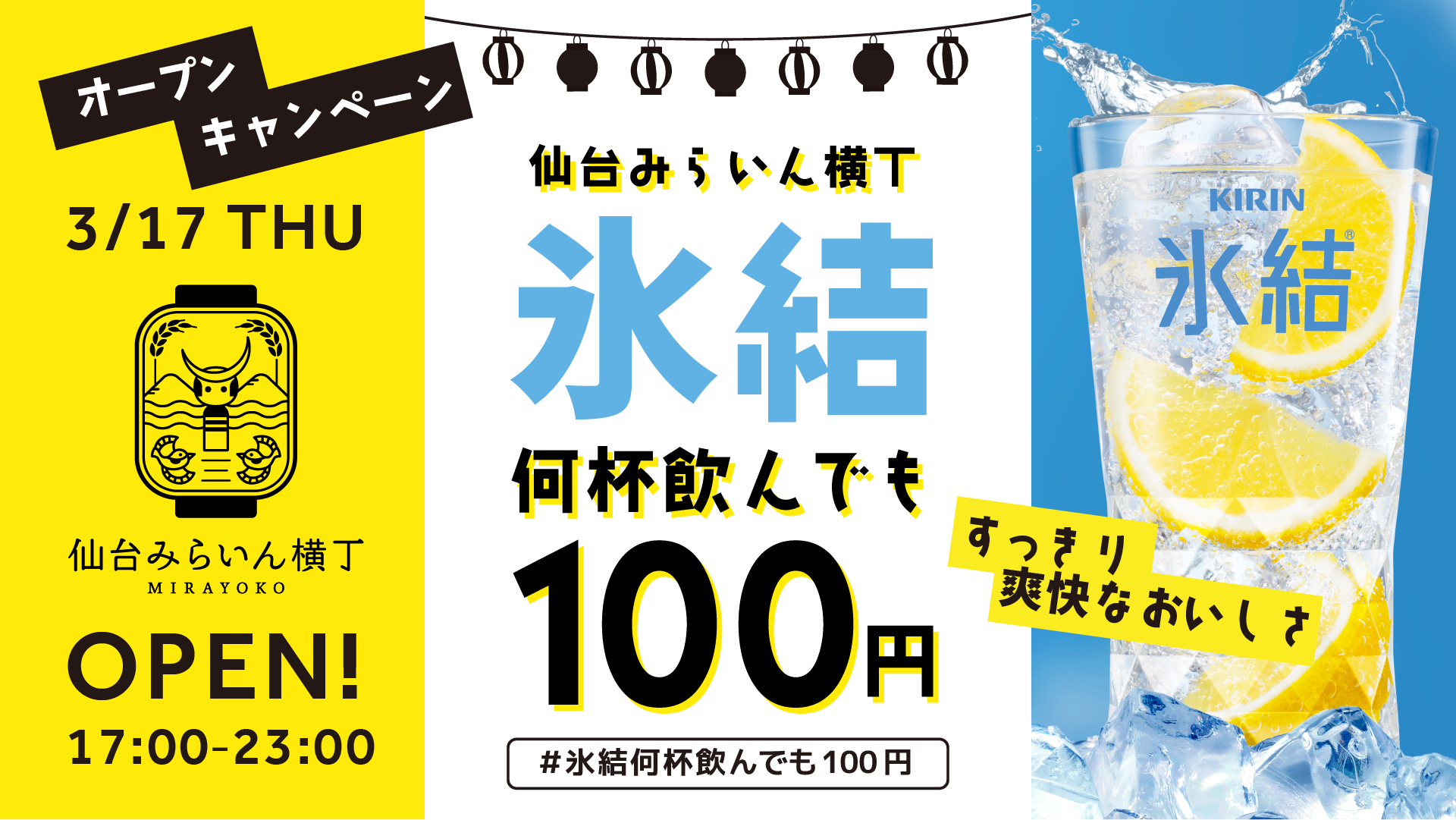 オープンを記念し、キリン氷結がご注文毎に100円になるキャンペーンを実施いたします。店内に設置してあるQRコードを読み取り、無料で会員登録をしていただくと「氷結レモン」「氷結無糖」の2つの商品をご注文毎に100円で提供いたします。ぜひご来店くださいませ。