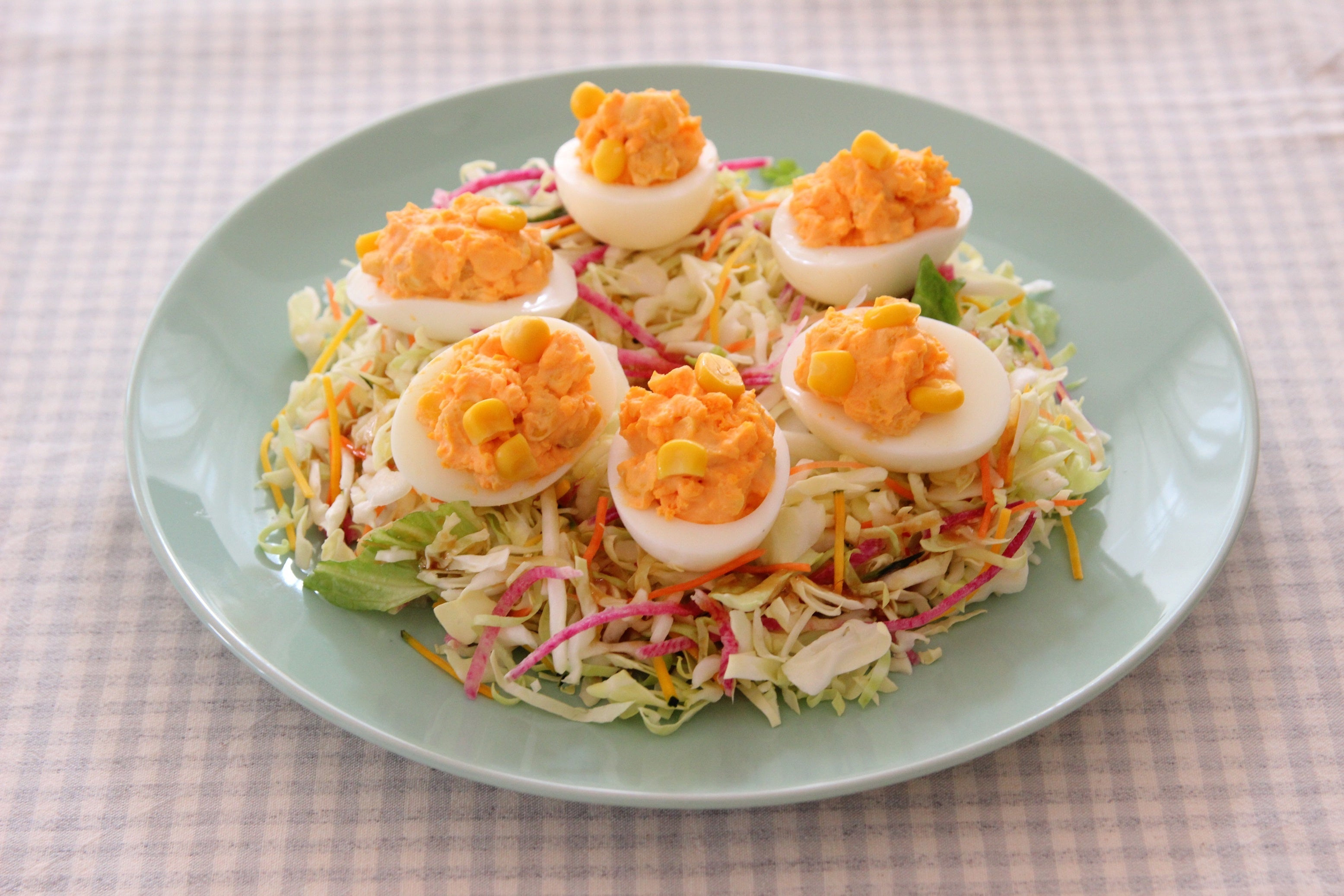 子どもも喜ぶたまごとコーンとマヨネーズの見た目もキュートなサラダです。マヨコーンとうまみ醤油の相性もばっちりです。