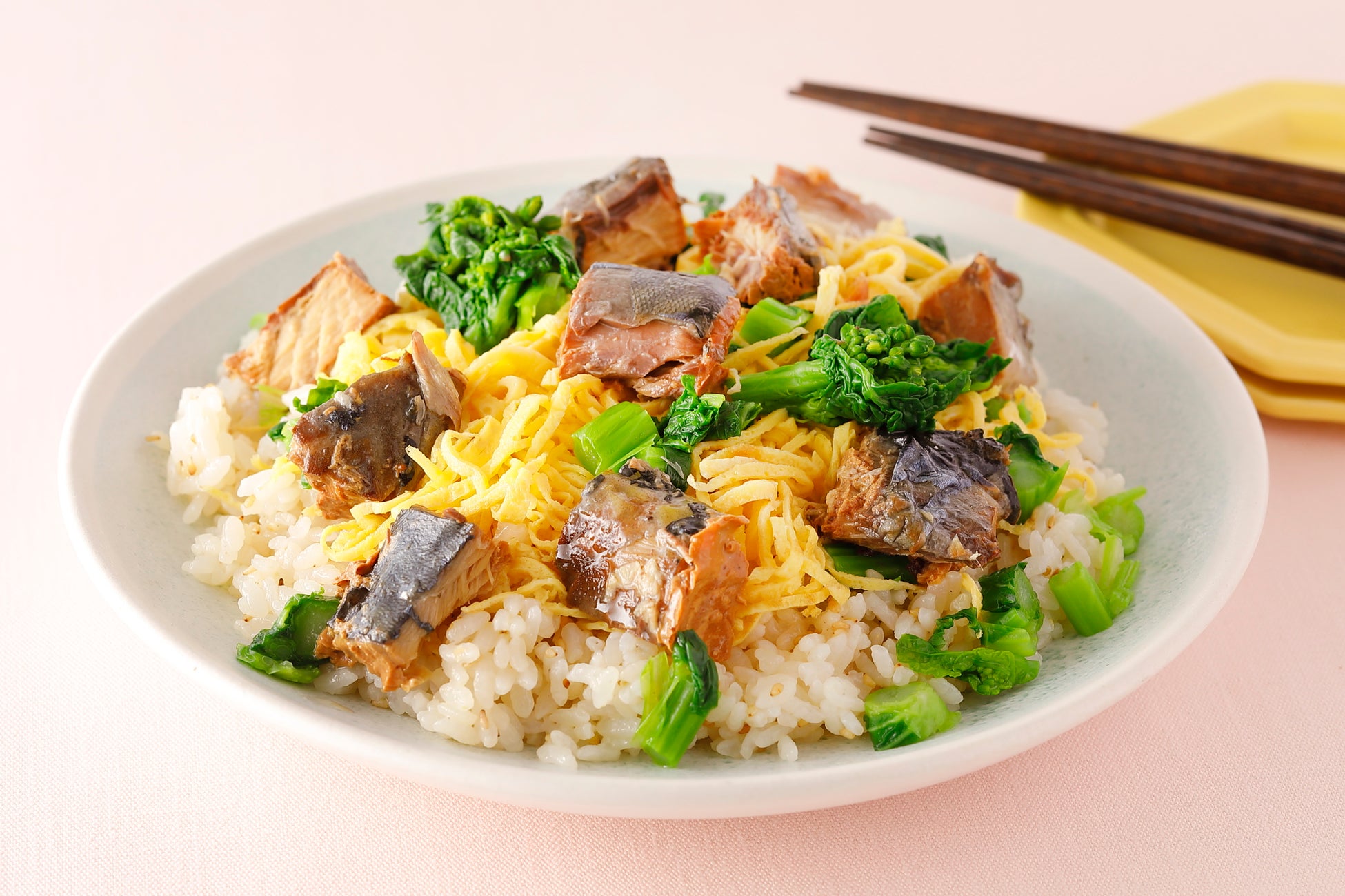 4.Bを混ぜて、熱いご飯に混ぜて器に盛る。錦糸卵、菜の花、鯖を散らして完成。