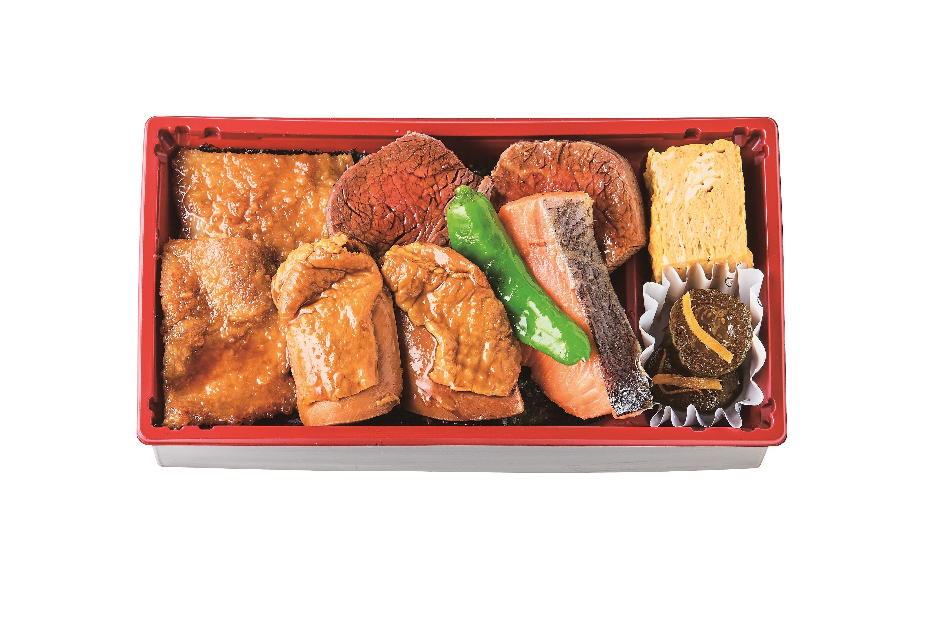 山本海苔店の日本橋限定の焼きたて海苔を使用した、海苔弁当。ご飯と海苔の上には店主がこだわって作る鮭の西京焼き、ヒレステーキ、竜田揚げ、鶏の照り焼き、卵焼きなどバラエティに富んだ一品がずらり。海苔の良い香りが引き立ち食欲をそそるお弁当です。
