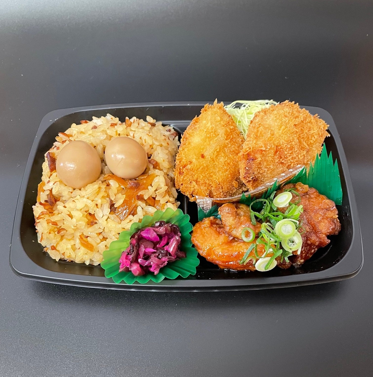 鶏めしに一番人気の黒酢南蛮九条ねぎ和えのからあげとチキンカツをセットにしてボリューム満点の