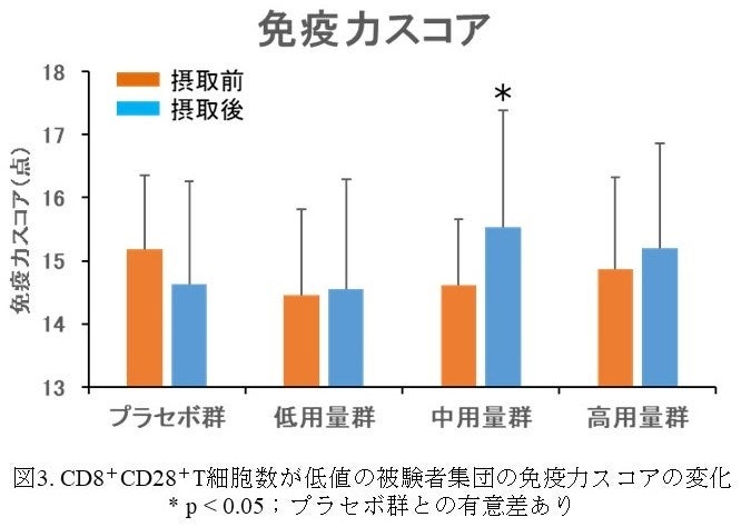 【結果】「カスピ海乳酸菌」を含む錠剤の継続摂取によりすべての群で排便日数(図1)、排便回数の有意な改善が認められた。またプラセボ群と比べて中用量群で乳酸菌群数(図2)が、低用量群でビフィズス菌数の変化量がそれぞれ有意に増加したことから整腸作用を介して排便状況が改善することが示唆された。血中の免疫細胞数に関し、中用量群でのナイーブT細胞(※7)数が有意に増加したものの、他の免疫指標や感冒症状に関する体調アンケートの有意な改善は認められなかった。しかしながら、加齢に伴い低下することが報告されているCD8+CD28+ T細胞数が全被験者の平均値未満の被験者を集めて層別解析を行ったところ、プラセボ群と比べて中用量群でナイーブT細胞数およびCD8+CD28+T細胞数が有意に増加し、免疫力スコア(図3)の改善が認められた。
