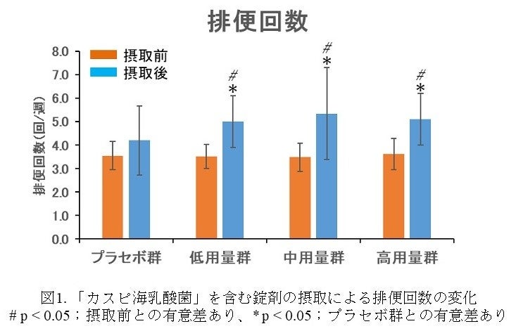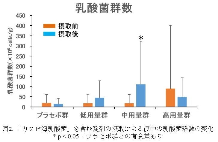 【方法】疲れやすく、便秘傾向の20~71歳の男女88名を4つのグループに分け、それぞれに「カスピ海乳酸菌」を含まない錠剤(プラセボ群)、50 mg含む錠剤(低用量群)、75 mg含む錠剤(中用量群)、100 mg含む錠剤(高用量群)を4週間摂取してもらった。摂取前と摂取4週間後に、排便状況や便中の腸内細菌数、血中の免疫細胞数や抗体濃度を測定した。