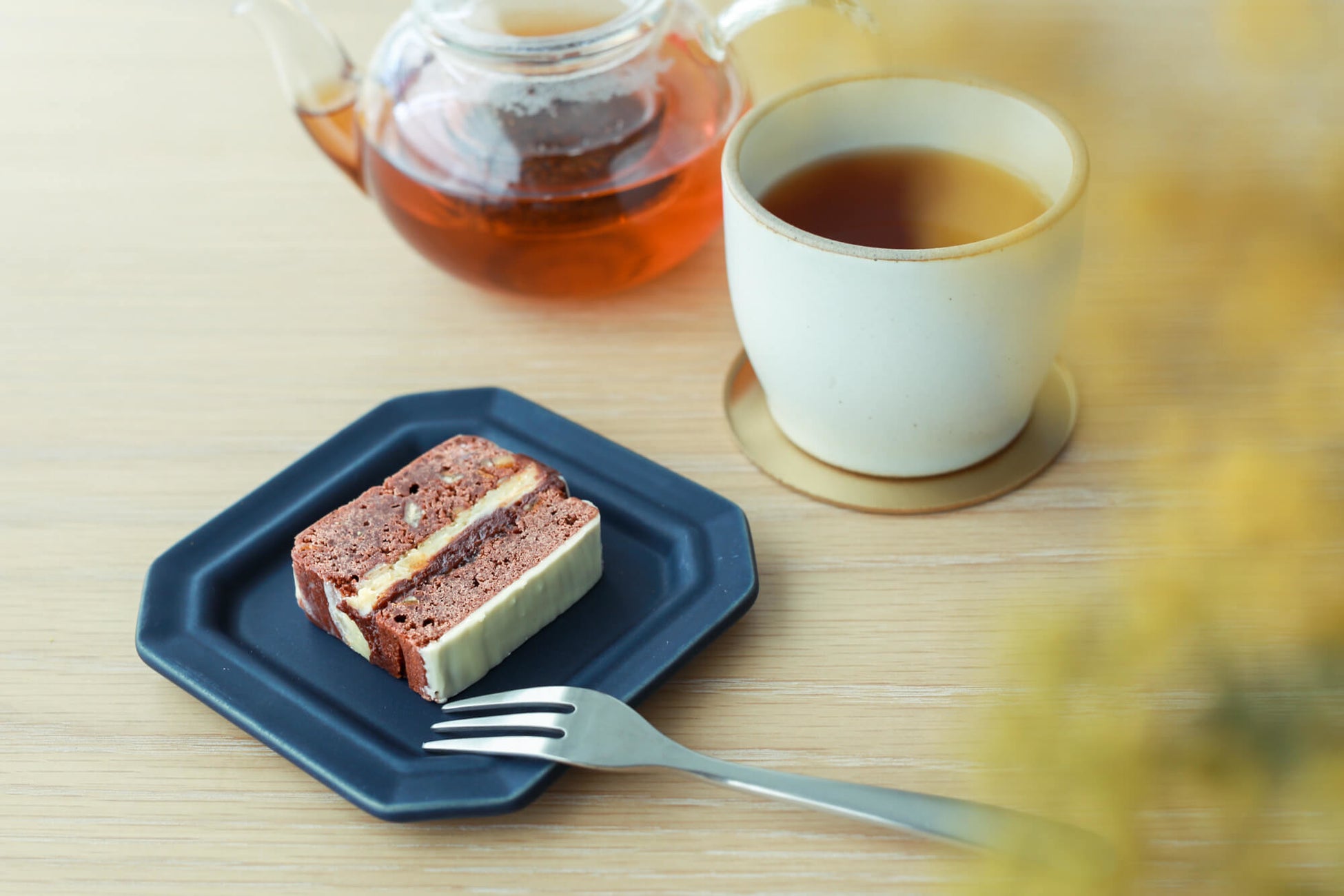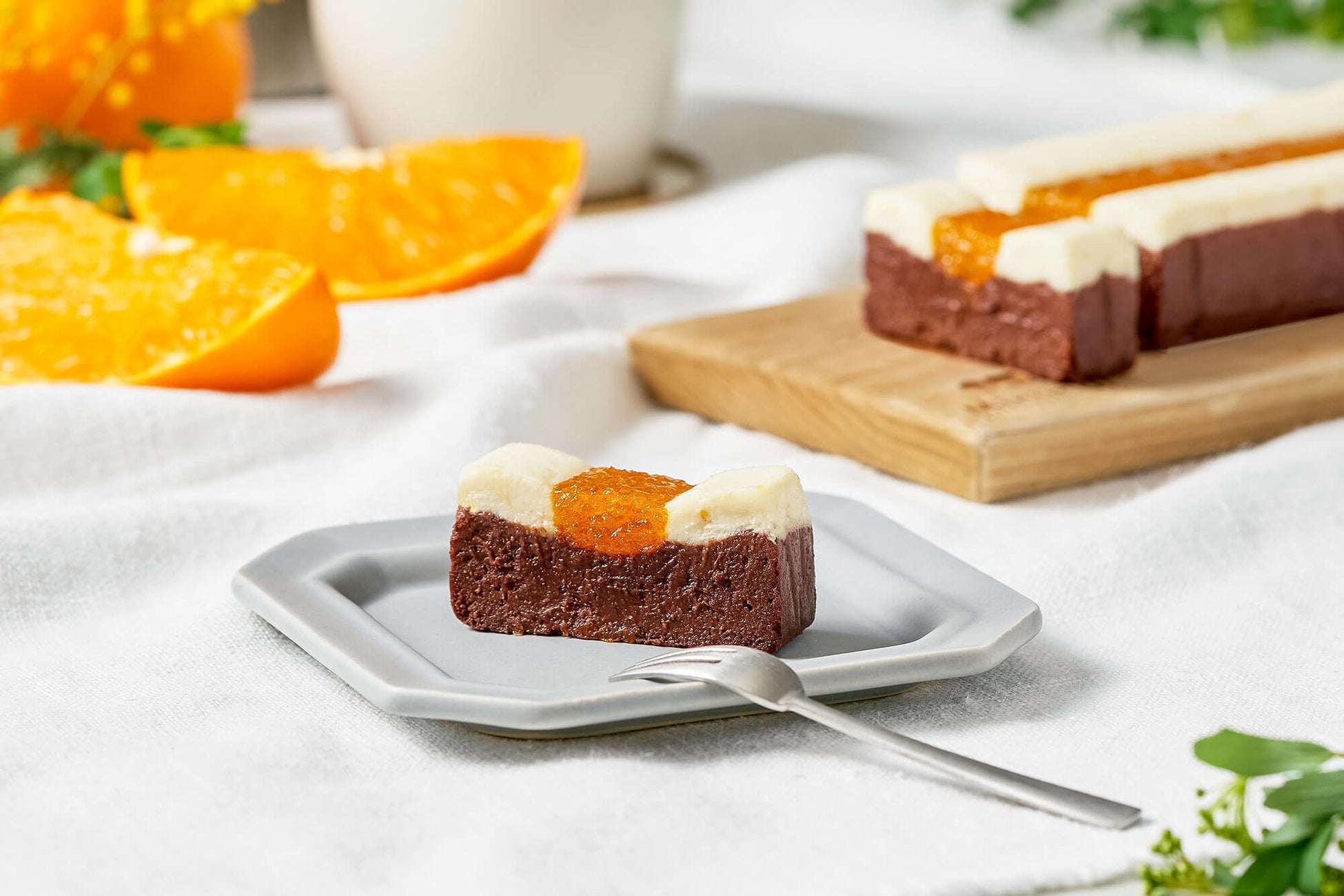 フレッシュでジューシーな蜜柑ジャムの鮮やかなオレンジが映える、春の訪れを楽しむ生ガトーショコラです。