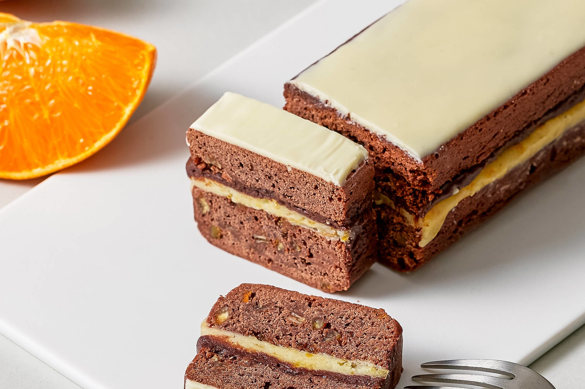 中央にはオレンジを混ぜ込んだスイートチョコレートとホワイトチョコレートのクリームを使い、オレンジの香りと甘味をプラスしています。