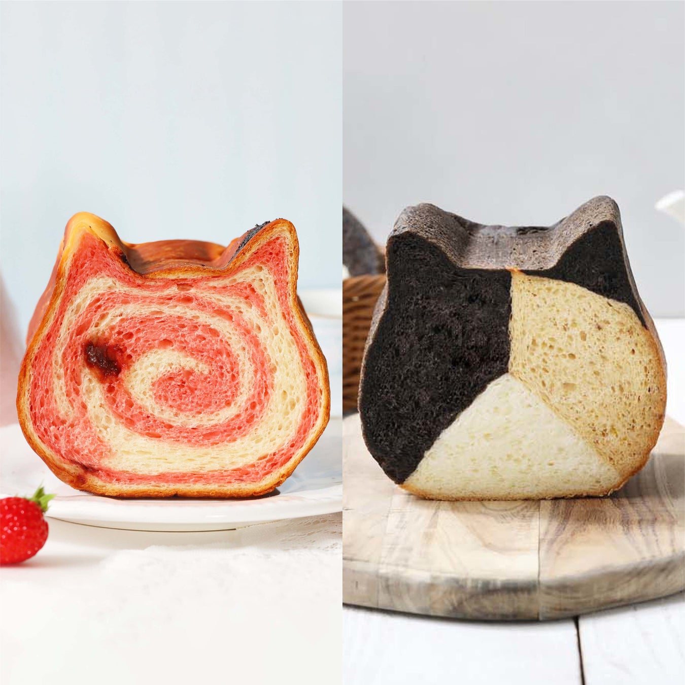 ミルク100%の生地といちごチョコを混ぜたいちご風味の2種類の生地を使用して焼き上げ、いちごの味わいが口いっぱいに広がるねこねこ食パンに仕上げました。ミルクの甘みを十分にお楽しみいただけるプレーン生地にいちごの甘酸っぱさが加わり、春らしく季節感をお楽しみいただけます。