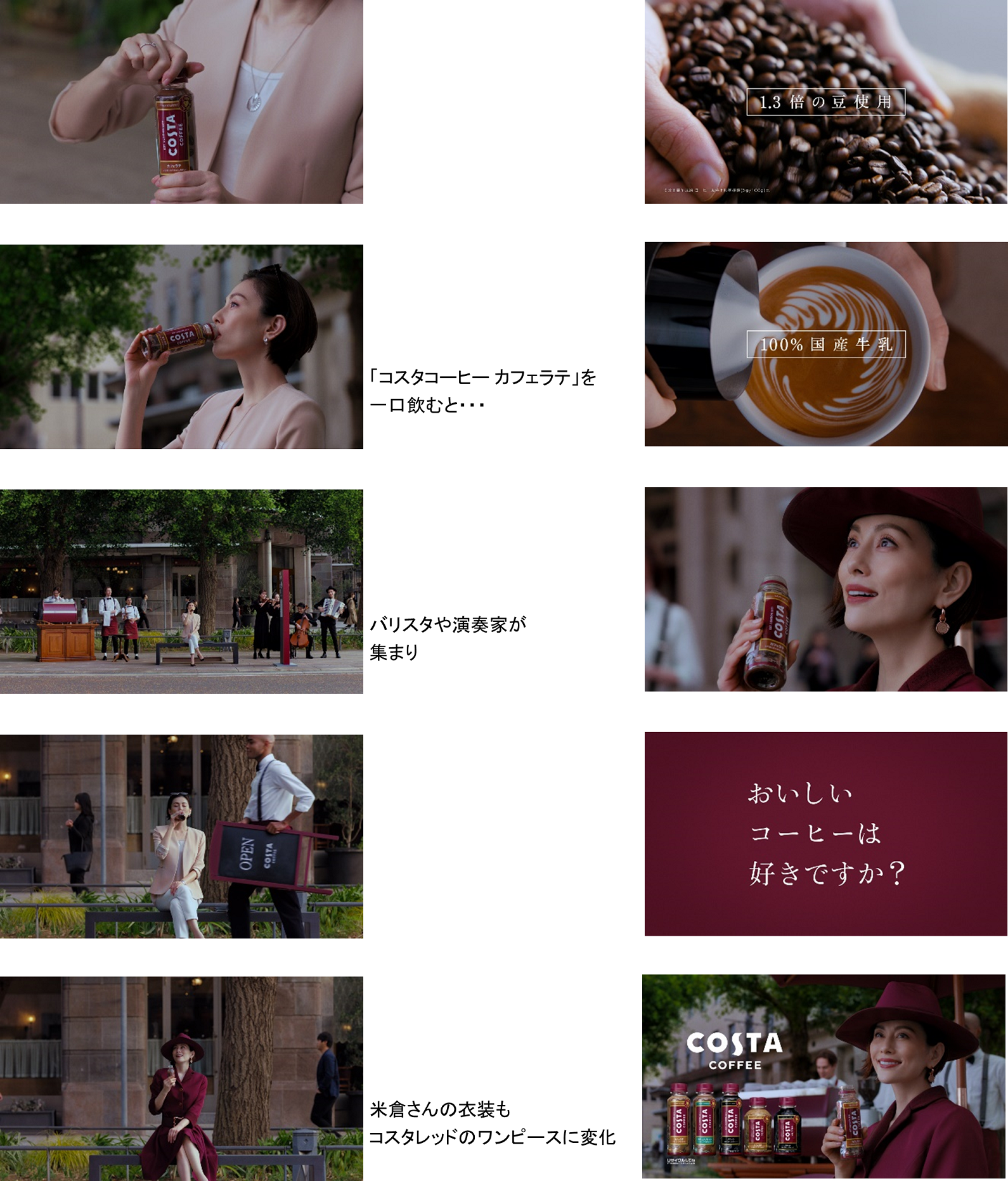 せわしなく人が行き交う街の中、ベンチに腰を掛ける米倉さん。「コスタコーヒー カフェラテ」を一口飲むと、素敵な音楽の生演奏とともにバリスタが登場し、まるでヨーロッパのカフェテラスでのコーヒータイムのような、上質な空間が広がります。シンプルなジャケットスタイルも、コスタレッドのワンピースに早変わり。コスタコーヒーを味わう印象的な米倉さんの表情から、「コスタコーヒー」ならではの、コーヒー豆、製法、ミルクへのこだわりが実現する本格的な味わいが感じられます。