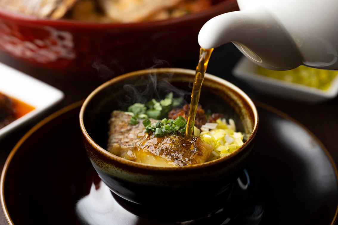 特製炒飯と程よい塩加減で焼かれた鯛が相性抜群の逸品。炒飯と鯛の身をそのままお楽しみいただいた後は、スープとXO醤・黄韮・香菜の薬味をかけて味の変化をお楽しみいただけます。スープをかけることでパリッと焼かれた鯛の皮の香りが溶け出し、より美味しさが増します。