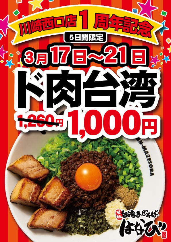 飲食店を中心に事業展開する株式会社ヴィア・ホールディングスの子会社である株式会社紅とん(東京都新宿区 代表取締役社長:横川 正紀)が運営する「麺屋はなび川崎西口店」が、おかげさまで、開店1周年を迎えました。この度、1周年を記念して、人気商品の「ド肉台湾まぜそば」を1,000円(税込)でご提供致します。