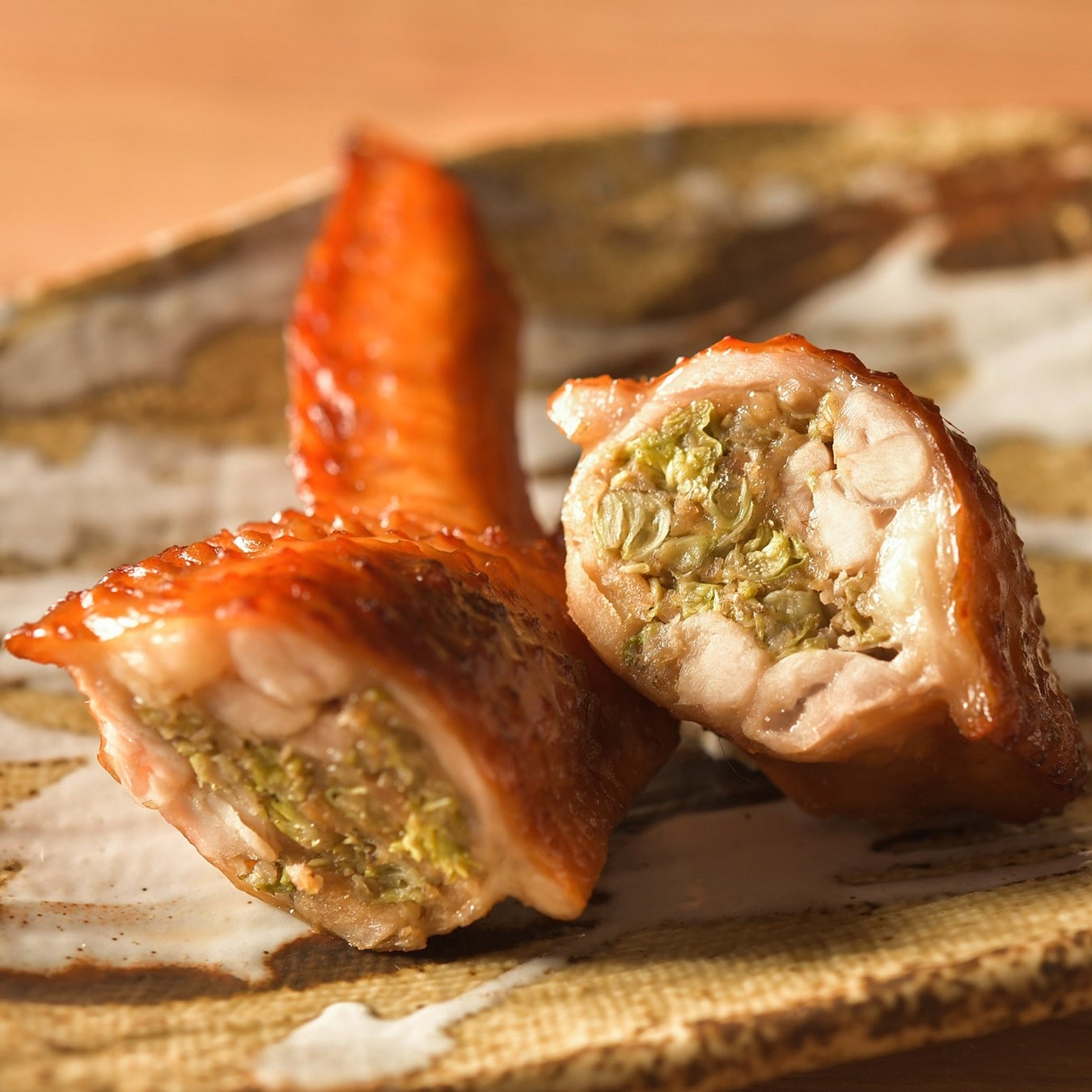 宮崎の加工場で丁寧に手仕込みし、お店でじっくり炭火で焼き上げてご提供する、地鶏の手羽餃子の春バージョンです。今季は春の芽ぐむ香りが食欲をくすぐる山菜「ふきのとう」の餡を詰めています。