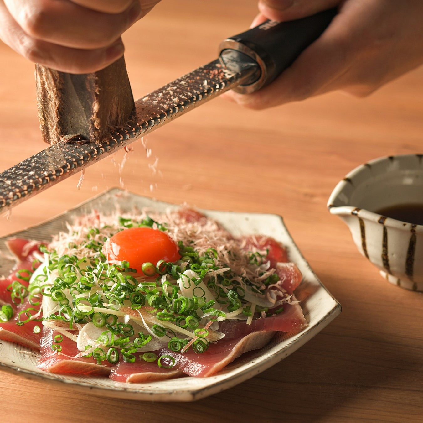 視覚、音、香り、新鮮な鰹の味わい、なめらかな食感…と、鰹の魅力を立体的に味わうことができる一品です。