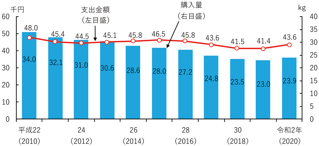 水産業界では「若者の魚離れ」が指摘されてきましたが、2020年の1世帯当たり(2人以上)の「生鮮魚介」購入量が18年ぶりに前年を上回りました。新型コロナウイルス感染拡大の影響で外食支出が大きく減り、スーパーマーケットなどで魚を買う機会が増えたことが理由と考えられます。(総務省の家計調査報告より)