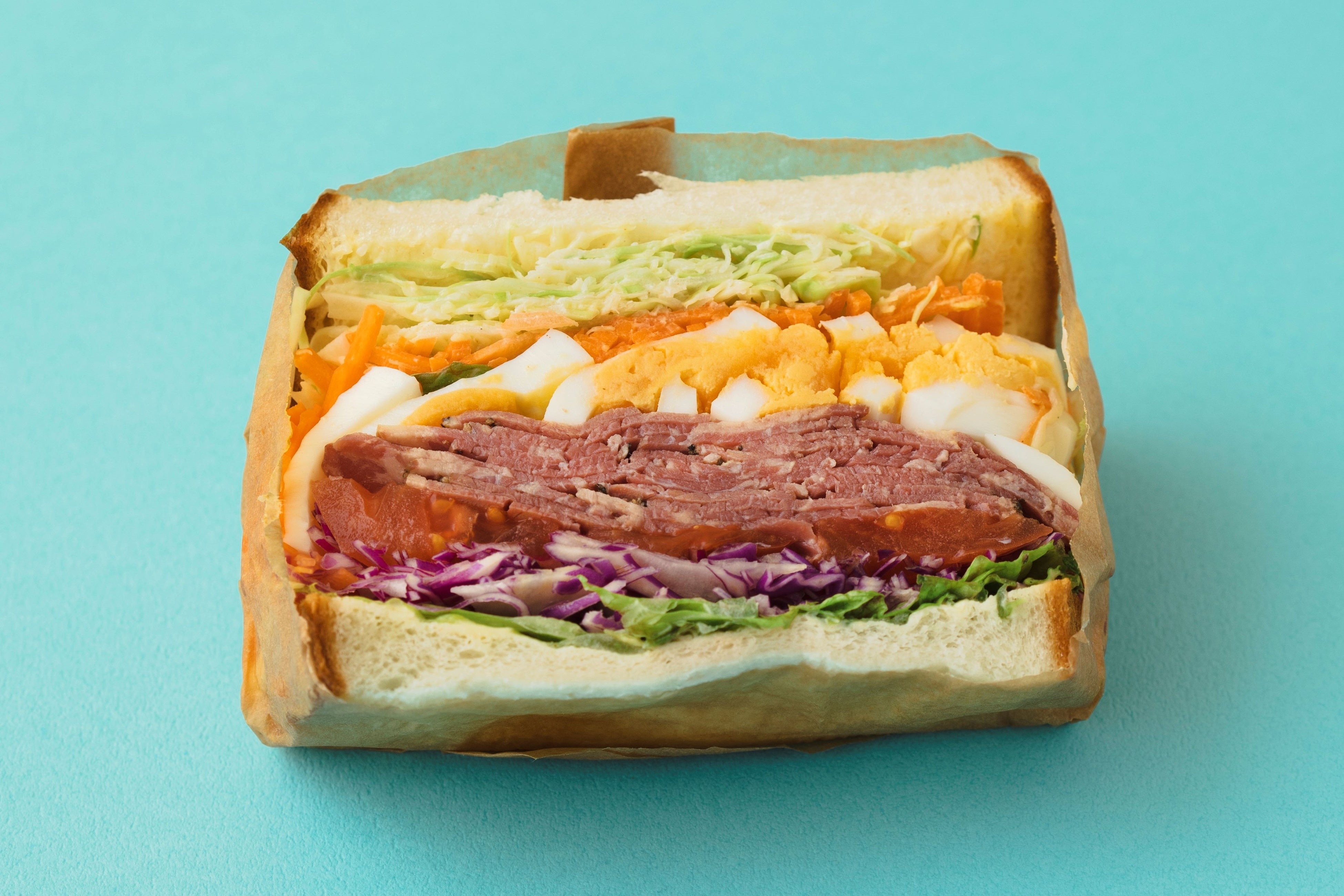 定番人気の角食パン「ベイカーズブレッド」にたっぷりの野菜とパストラミビーフを挟み、見た目も華やかになるよう配色もこだわりました。