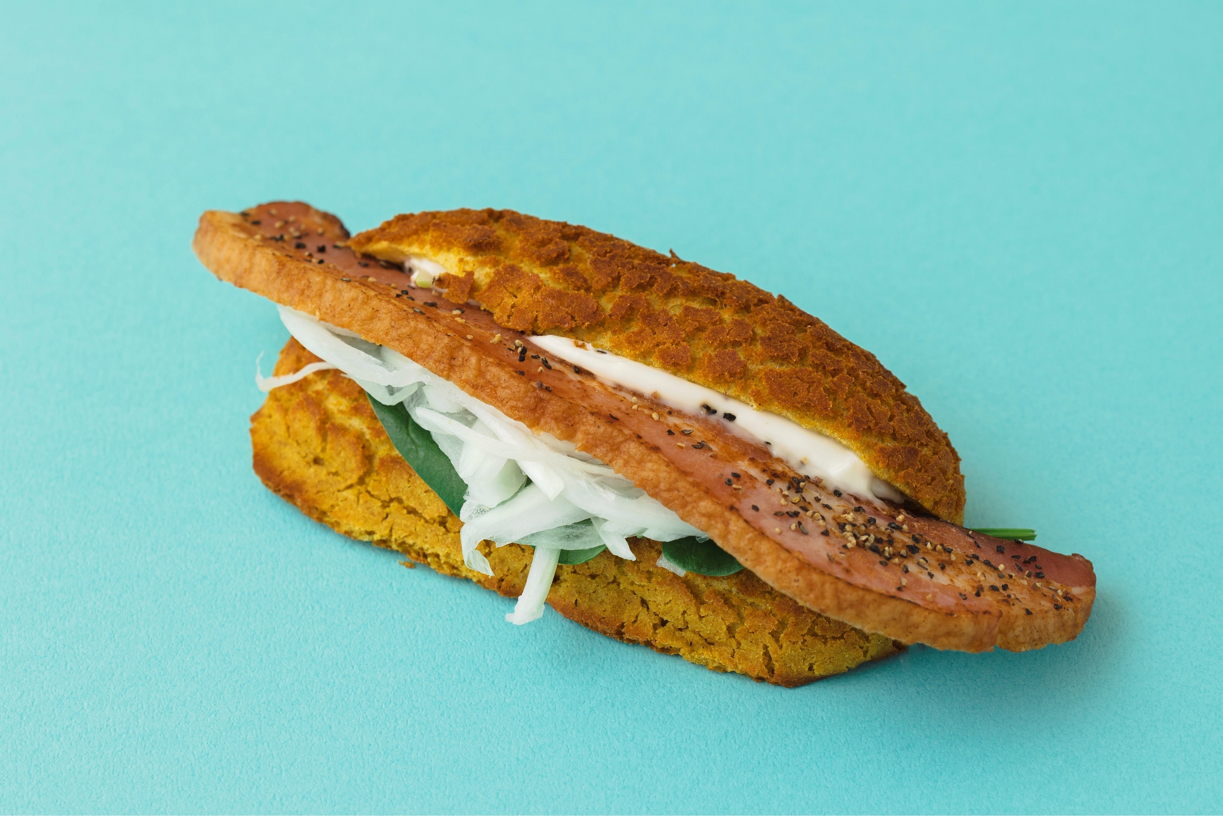 東京駅限定商品キタノカオリブレッドの生地を使用し、そこにカレー粉を混ぜスパイシーな生地にしました。さらに表面のカリカリなダッチクリームにもカレー粉を加えて追いスパイシーに。緑豊かなベビーリーフ、辛味のあるスライスオニオンをこれでもかと挟み、主役の厚さ8ミリの厚切りベーコンを炙り、ブラックペッパーをかけてサンドしました。