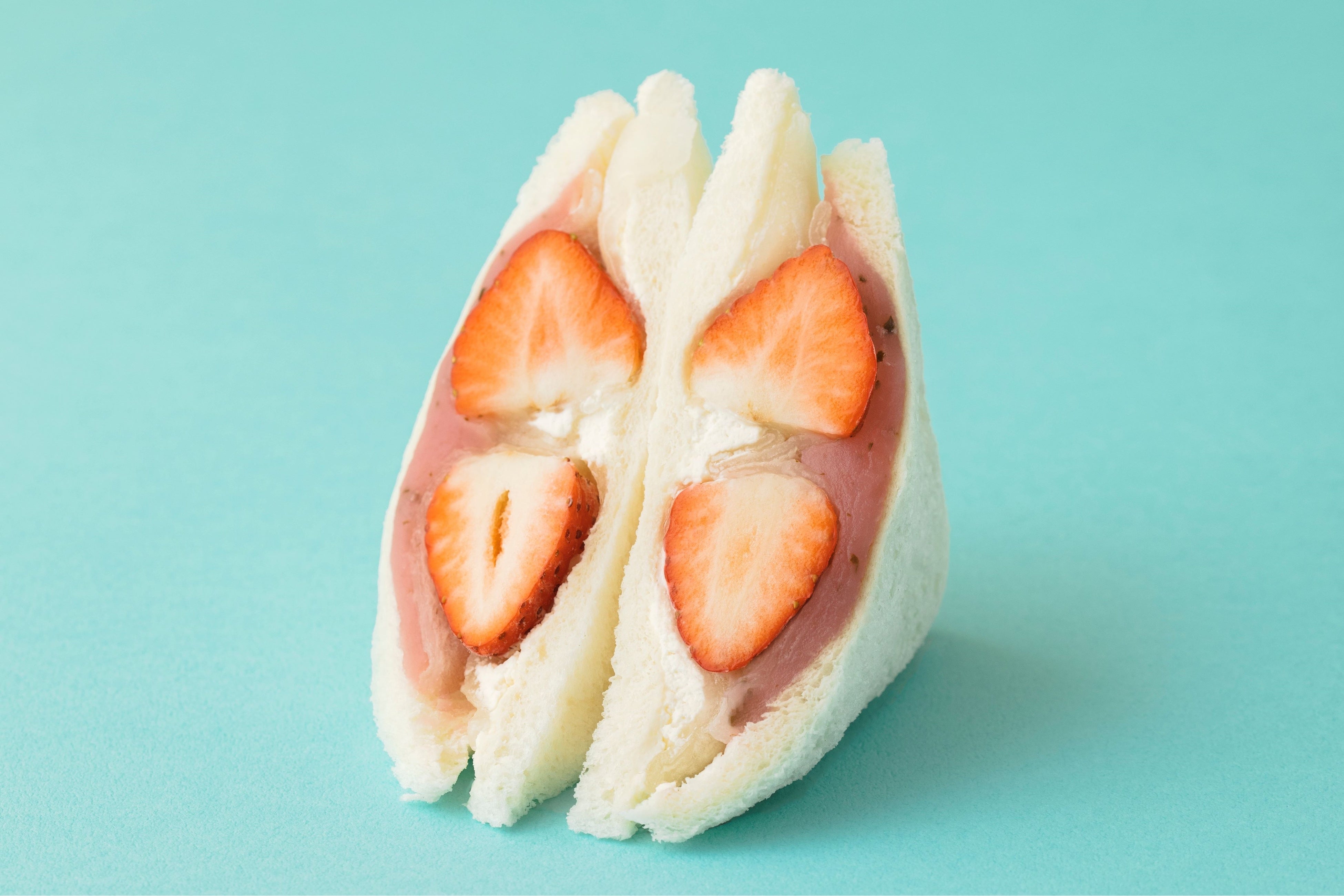 ピンク色のラズベリークリームで白いちごをサンド。可愛らしい見た目のサンドイッチです。
