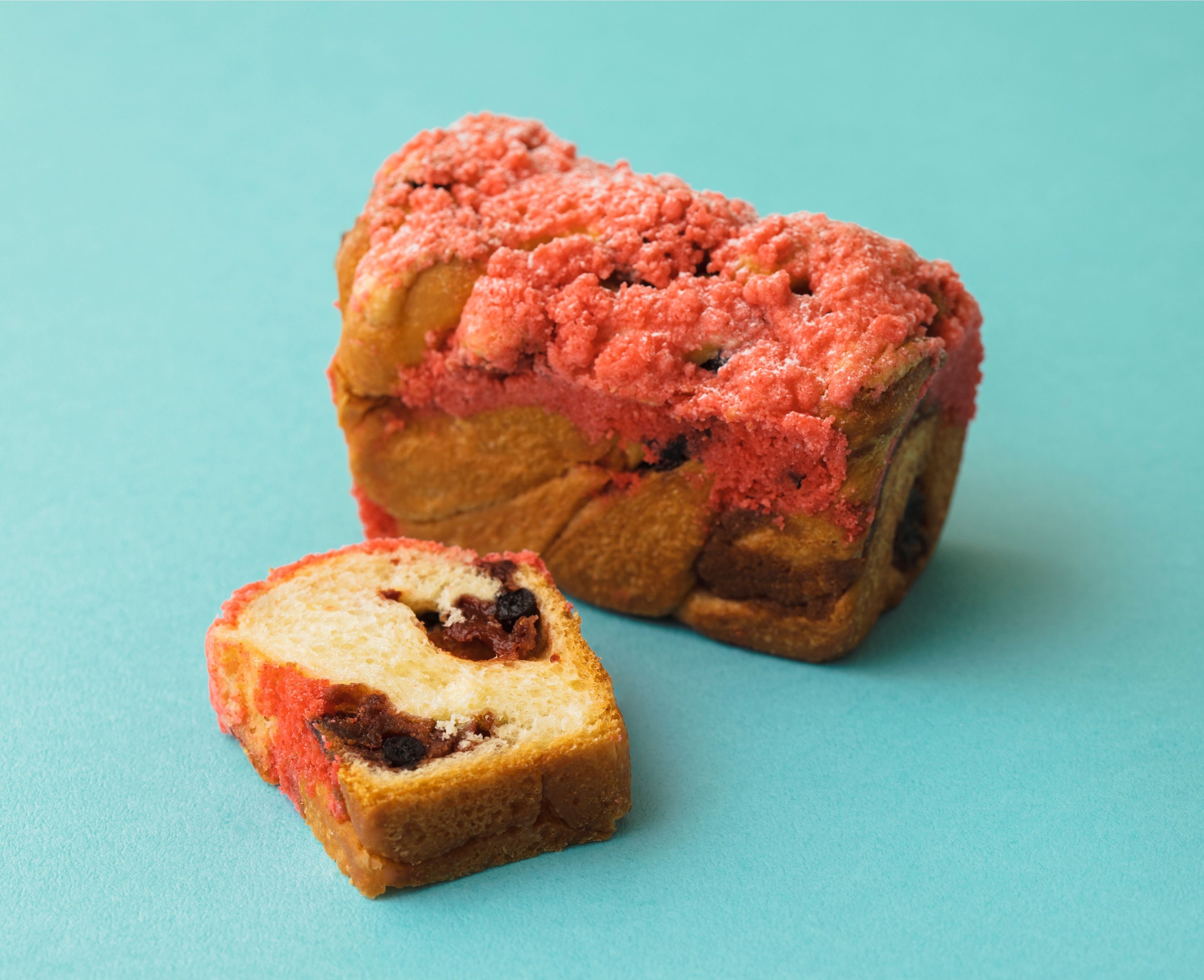 甘酸っぱい3種のベリー(ドライストロベリー、ドライブルーベリー、ラズベリージャム)を生地に織り込んだ、春らしい色のブリオッシュです。販売期間:3/1~4/30