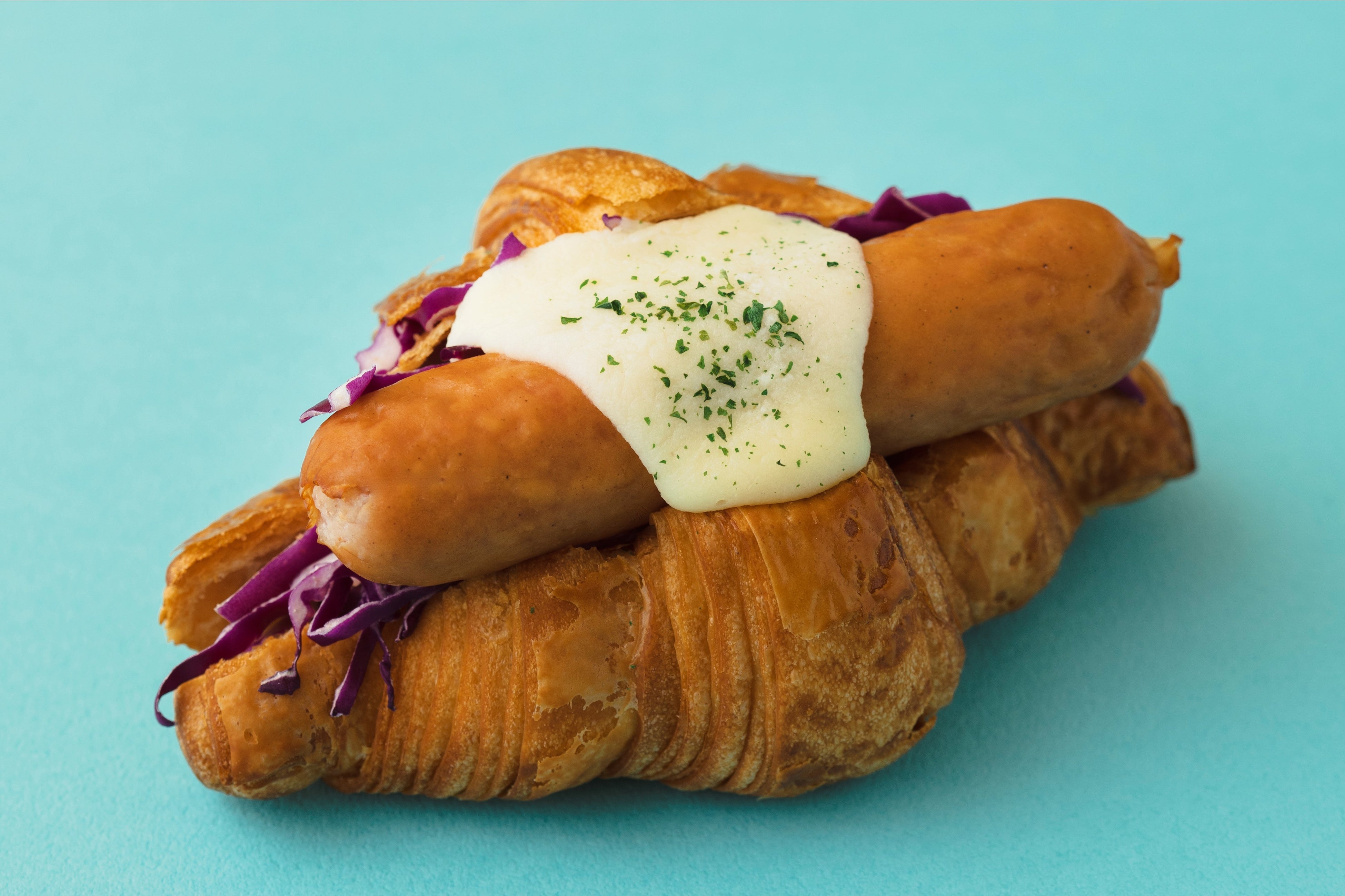 プレミアムクロワッサンにジューシーで大きなソーセージをまるまる1本サンドしました。野菜もたっぷり挟み、アクセントに粒マスタードを加え、上部にチーズをトッピング。ボリューム感たっぷりのクロワッサンサンドに仕上がりました。