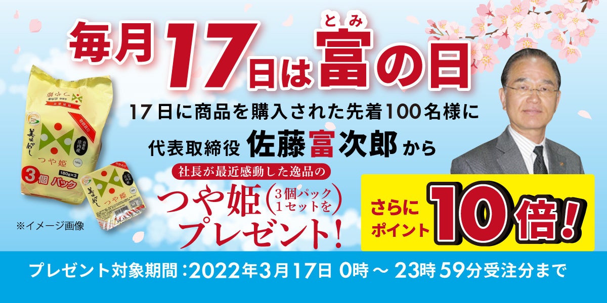 キャンペーン第4回目の3月17日(木)は、商品をご購入された先着100名様に“社長が最近感動した”逸品「美味かめし つや姫(3パック入)」をプレゼントいたします。さらに「ポイント10倍」になります。