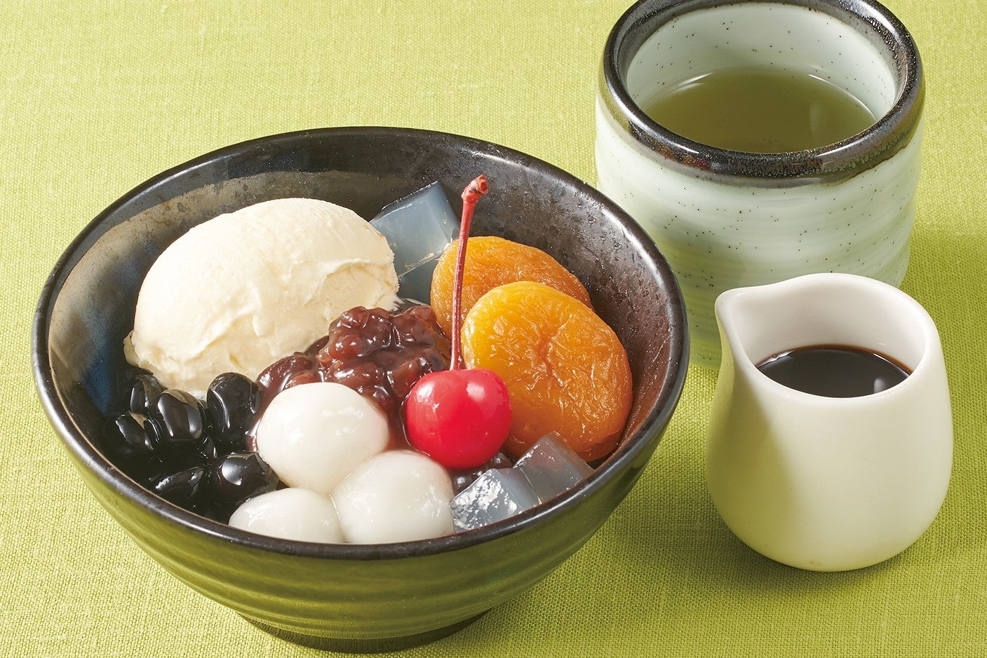黒豆白玉あんみつ+トッピングバニラアイス 緑茶&黒蜜つき