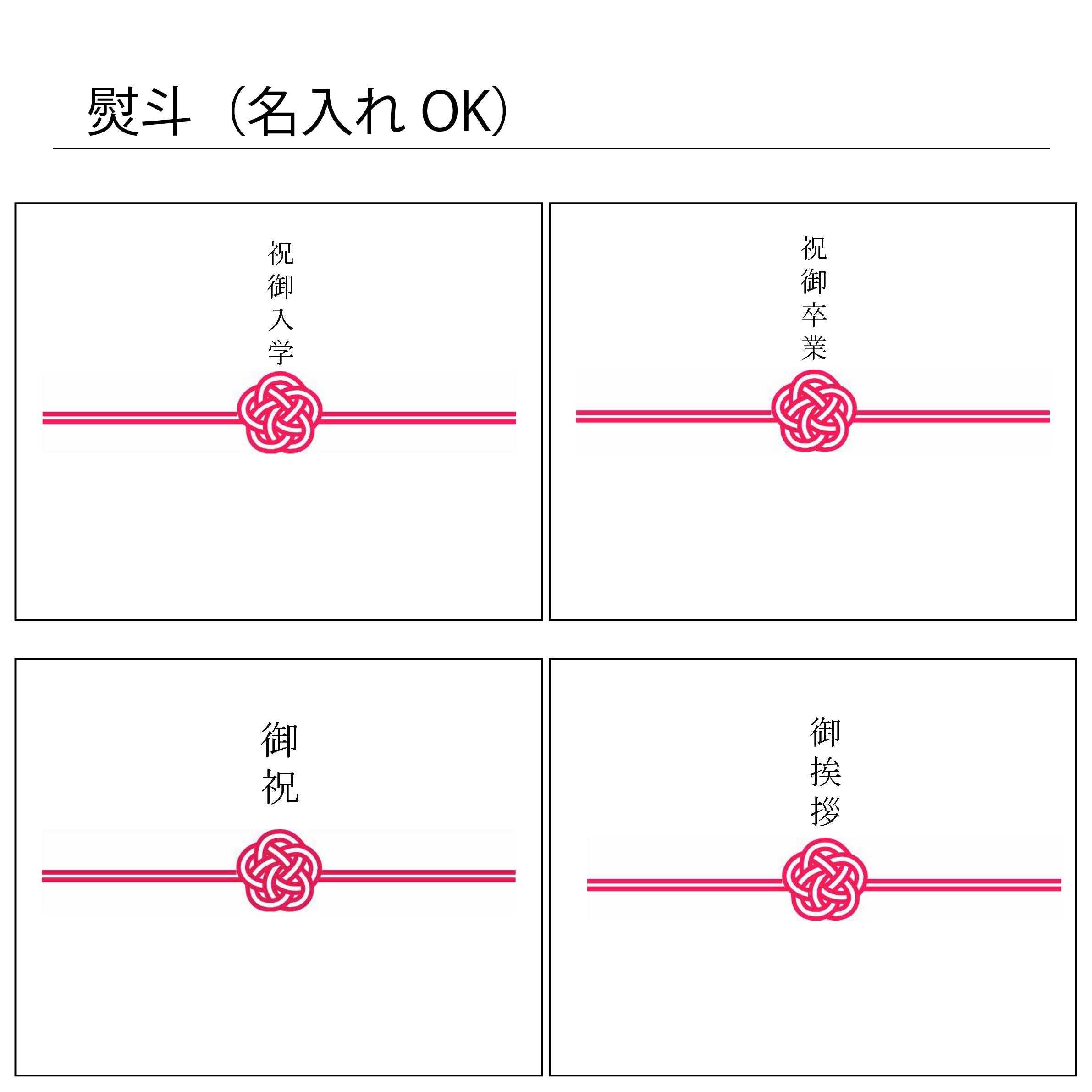 熨斗(①御祝入学②御祝卒業③御祝④御挨拶)、⑤ラッピング&シールの5種類の包装をご用意しております。