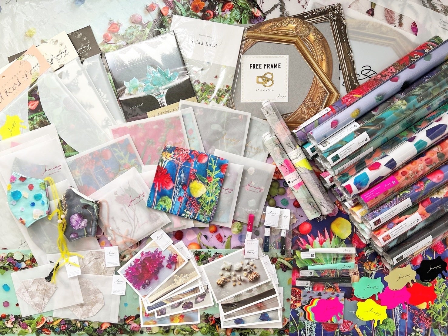 敷くだけであっという間に食卓が華やかになるアートなフードを演出するアイテムや、切りたてのきらきらこうぶつの柄を使って包装紙、ハンカチ、カードなど…ハラペコラボのグッズの世界もどうぞお楽しみください。