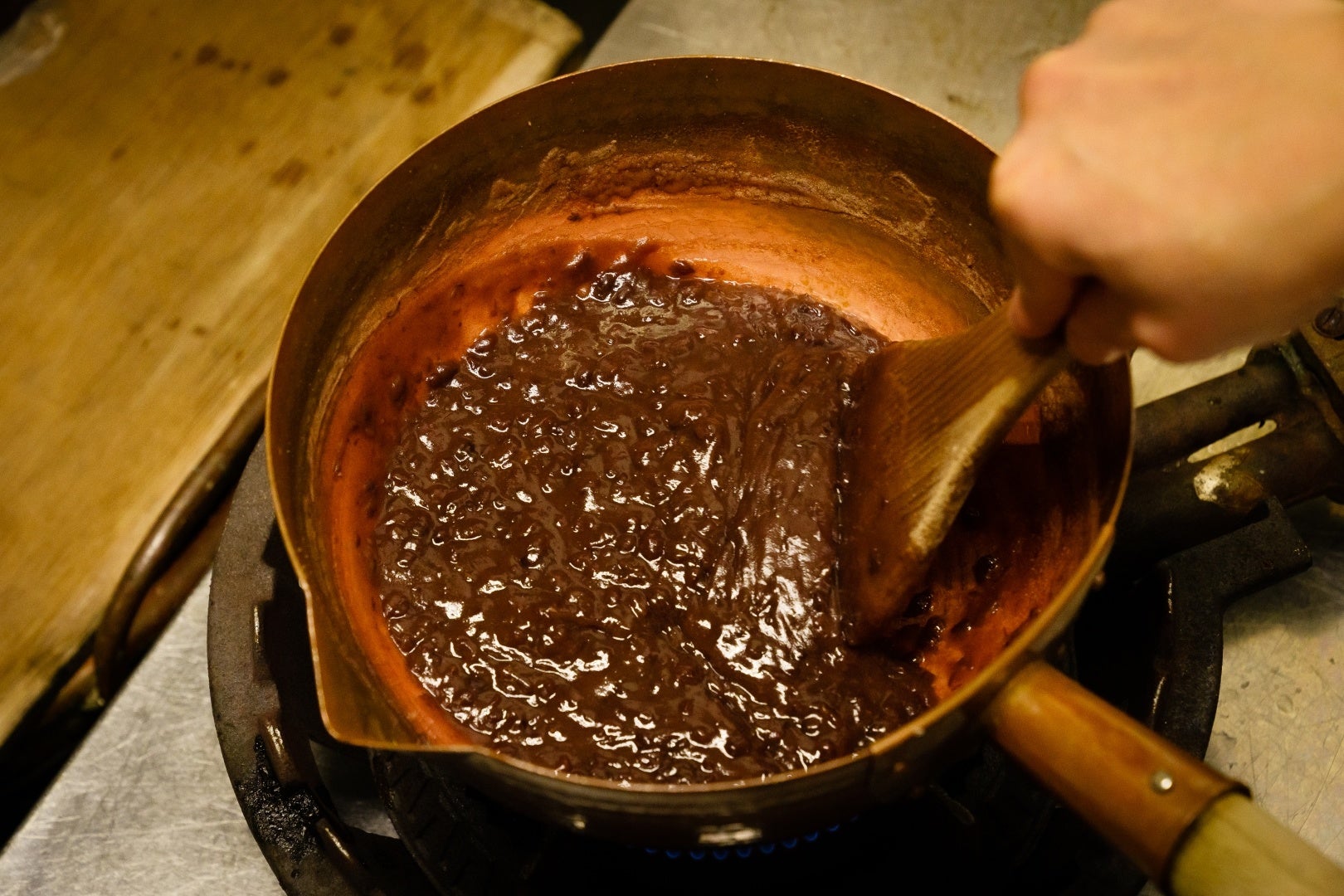 最高級の丹波大納言小豆を丹精込めて煮込んで練り上げるあんこジャムの美味しさは、職人の熟年の勘と技がぎっしり詰まっています。繊細な餡は、季節や天気その温度、湿度によってその作り方を微妙に変化させ、またあんこ自身が教えてくれる練り上げのタイミングを忘れてはなりません。そうした仕込みの機微こそが、美味しいあんジャムの味わいと食感を生み出します。添加物も使用しないよう心掛けた安心の一品。