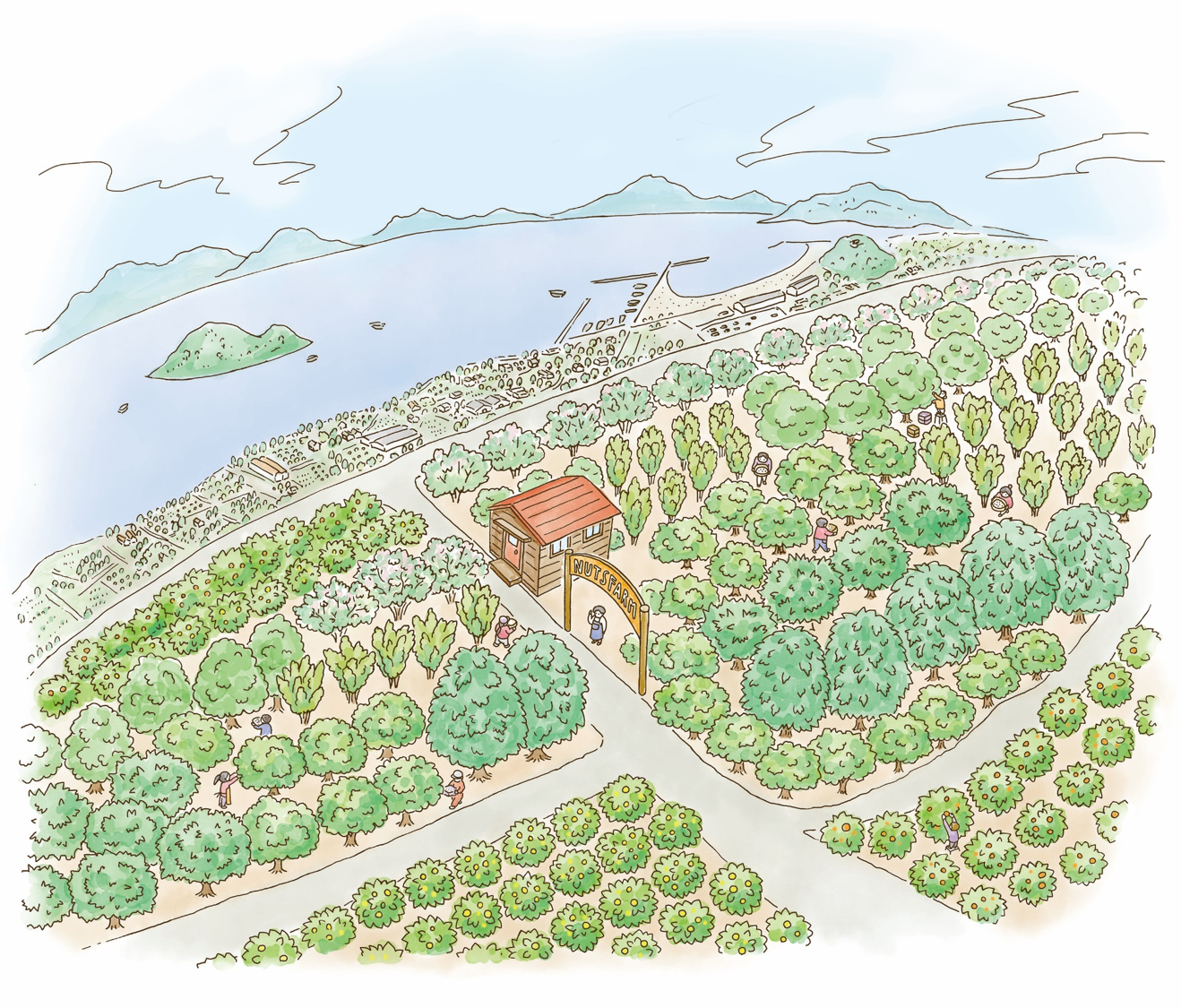 私たちはここにアーモンド、ピスタチオ、マカダミアナッツ、くるみ、ピーカンナッツ、ヘーゼルナッツの木を植え育てる、しまなみナッツファームプロジェクトを始めます。6種類のナッツが植えられた農園はまだ日本になく、世界の産地でも基本的には単一のナッツ農園であり、このような事例は聞いたことがありません。植樹会には子どもたちも参加し、「◯◯ちゃんのアーモンドの木」、「◯◯くんのピスタチオの苗木」などを植えていきます。