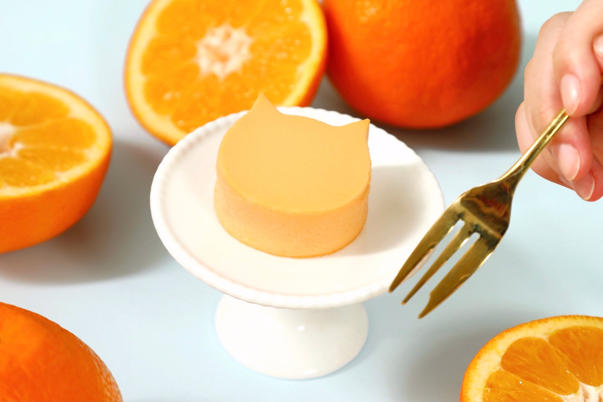 また、丁寧に高温焼成をすることでこんがりと焼き色を付け、バスク風に仕上げた「にゃんチー プレーン」とのセットも登場。まろやかながらもフレッシュな味わいのオレンジフレーバーと、本格的なチーズのコクをお楽しみいただけるプレーンフレーバーを食べ比べていただくのもおすすめです。