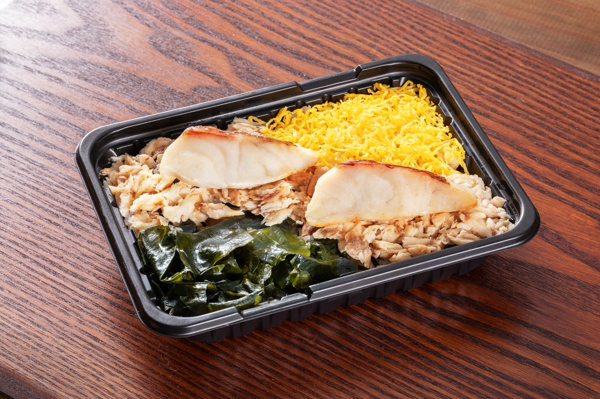 えきそばの出汁で炊いただし飯の上に、六甲粗味噌に漬け込んだ身のほか、鳥そぼろや高菜漬け、錦糸卵を載せた飽きのこない味わいです。