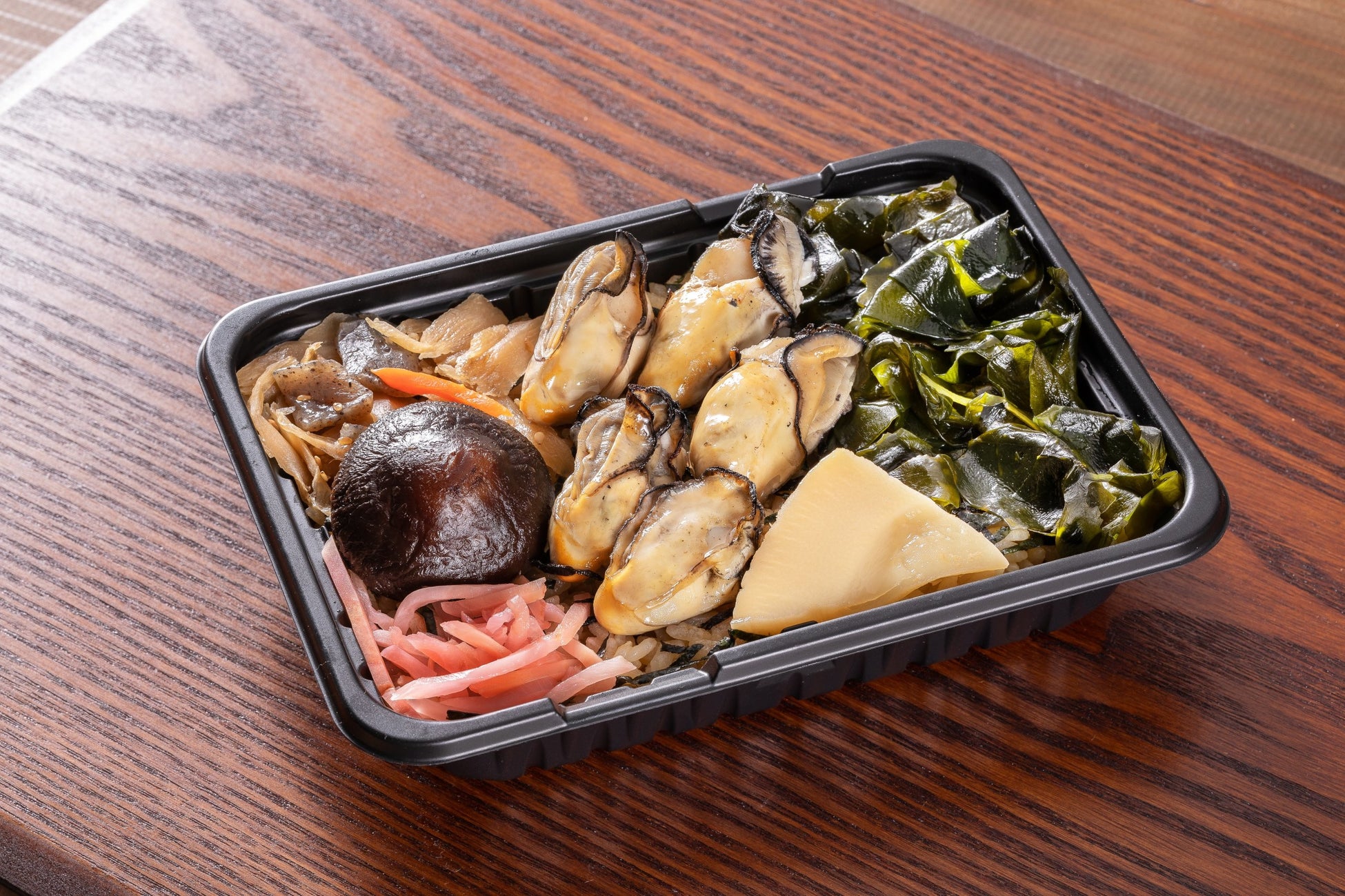 瀬戸内産の牡蠣はクセが少なく、プリッとした身が特長です。そんな牡蠣を存分に味わってもらえるようご飯は牡蠣ペーストを調合しただしで炊き、身は調味料に漬け込んだ後ふっくら蒸し焼きに。磯の香りが広がります。