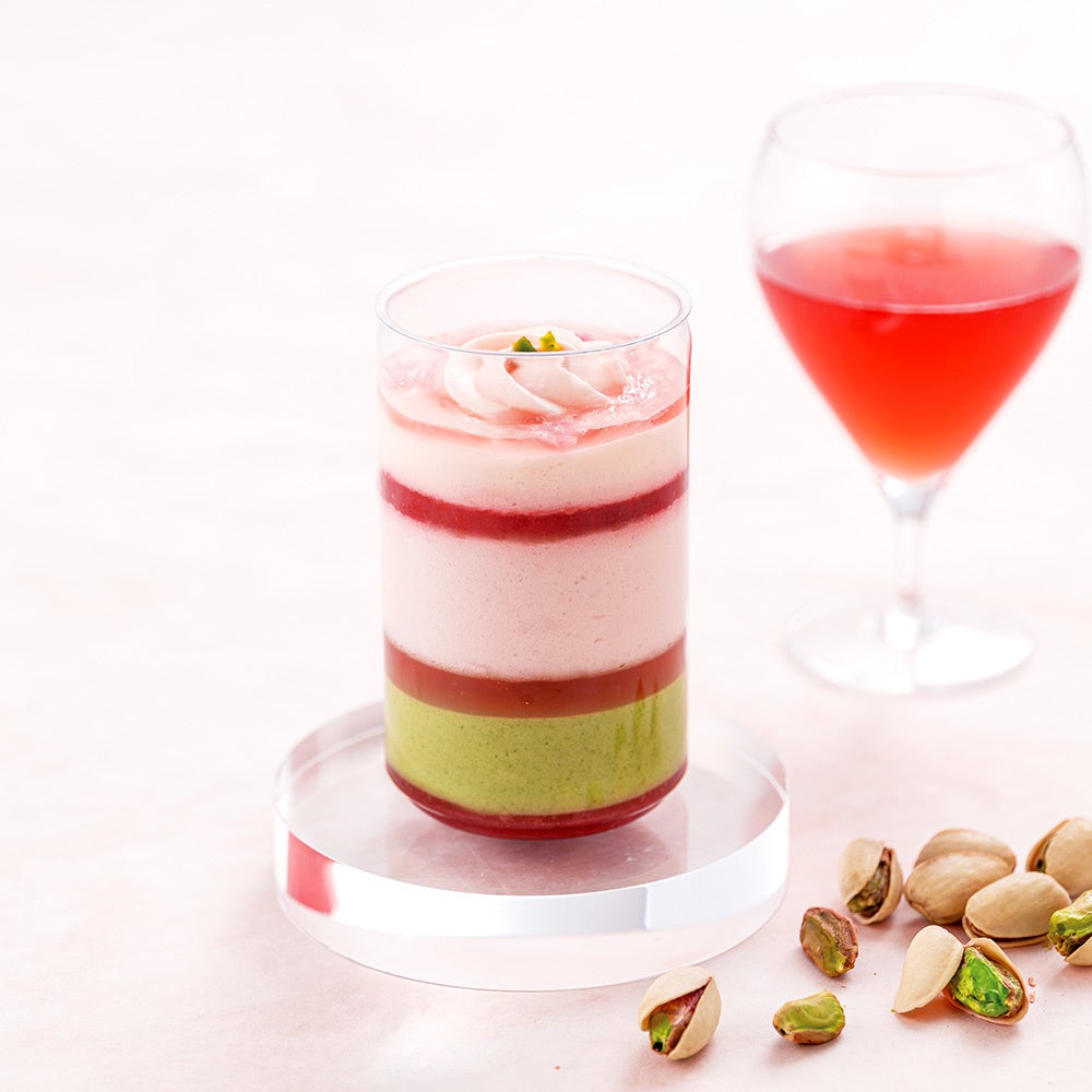 大人のための春限定スイーツ「Petitパフェ花咲(はなさき)」。丹波ロゼワインを主役にした、これまでの茶寮都路里にはない異色の素材を組み合わせ限定パフェをお届けします。メインとなるワインは「てぐみ丹波ワイン」の酸化防止剤無添加スパークリングロゼを使用。桜の花を生かしたロゼの色味と美しさが春を感じさせます。ピスタチオ+抹茶+ロゼの黄金比から生まれたワイン入りのピスタチオムースには、隠し味として抹茶を使用し、コクを深めました。グランマルニエを入れたストロベリーソースは酸味の中にもまろやかさとコクが感じられ、大人のためのパフェにすっきりとした余韻を与えます。花びら一片一片願いを込めて作る春限定パフェ。新たな茶寮都路里の味わいを季節とともにお届けします。