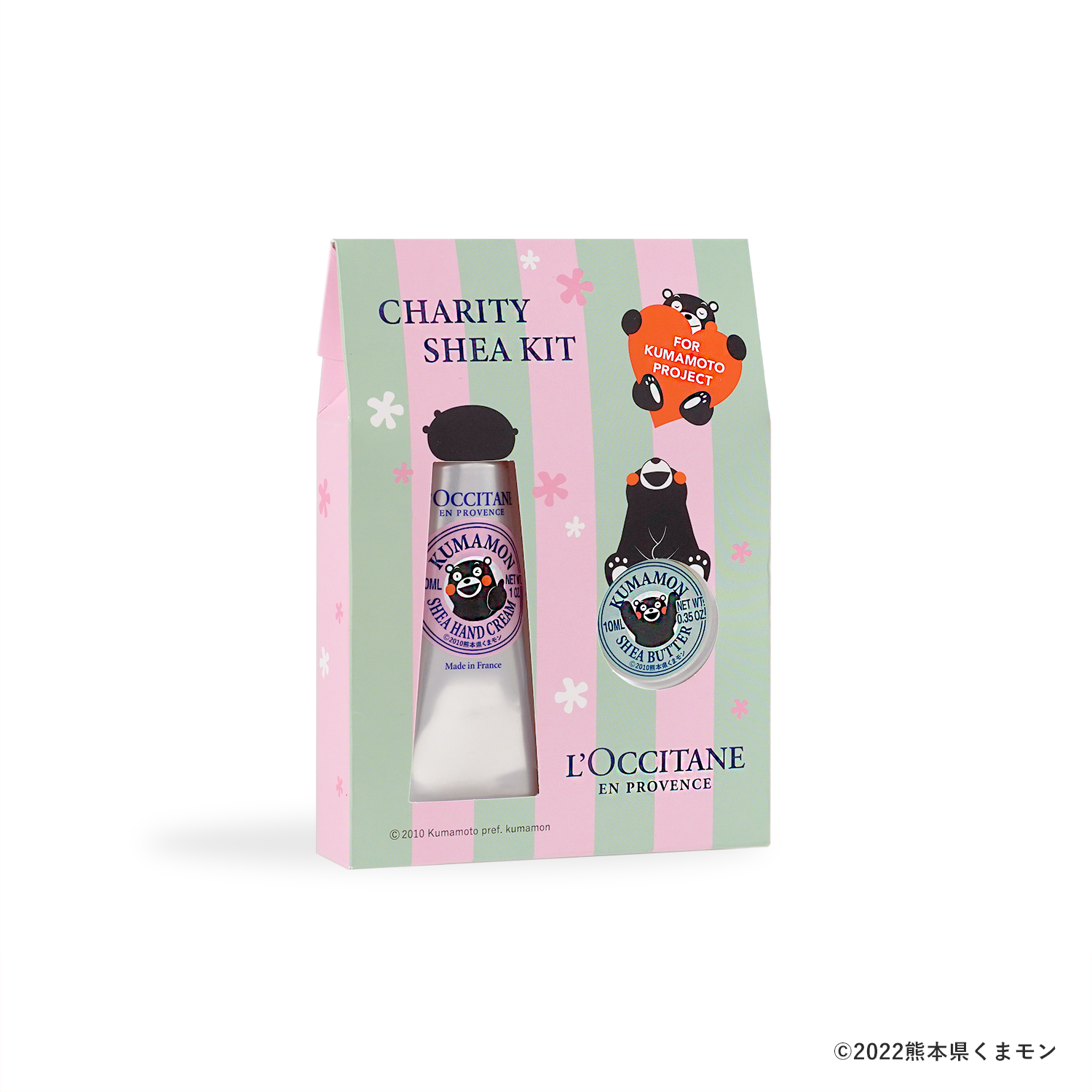 同製品は、くまモンのイラストがデザインされたオリジナルボックスと、ロクシタンの人気のハンドクリームと保湿バームが入ったキット。収益*はすべて「Present Tree in くまもと山都Ⅱ」に寄付されます。