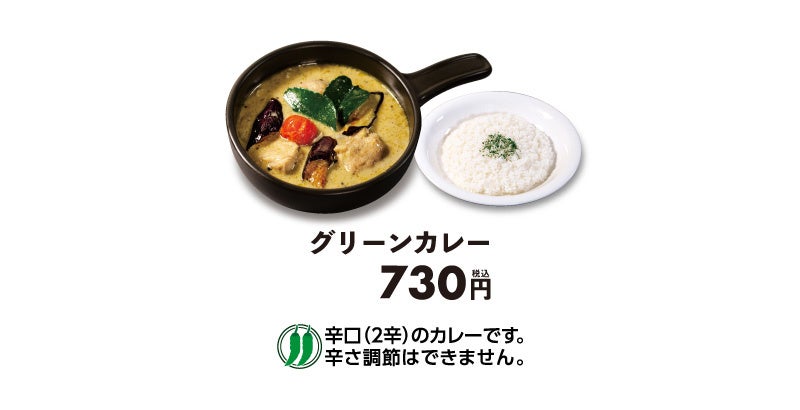 | 商品名 グリーンカレー 730円 ※お持ち帰りいただけます。 ※全て税込み価格です。また、店内・お持ち帰りの税込価格は同一です。 発売日 【マイカリー食堂専門店】3月15日(火)10時 ~ 対象店舗 一部店舗を除く全国のマイカリー食堂 |