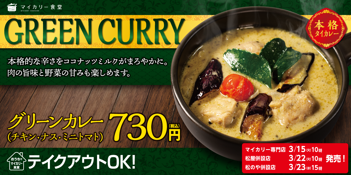 | 商品名 グリーンカレー 730円 ※お持ち帰りいただけます。 ※全て税込み価格です。また、店内・お持ち帰りの税込価格は同一です。 発売日 【マイカリー食堂専門店】3月15日(火)10時 ~ 対象店舗 一部店舗を除く全国のマイカリー食堂 |