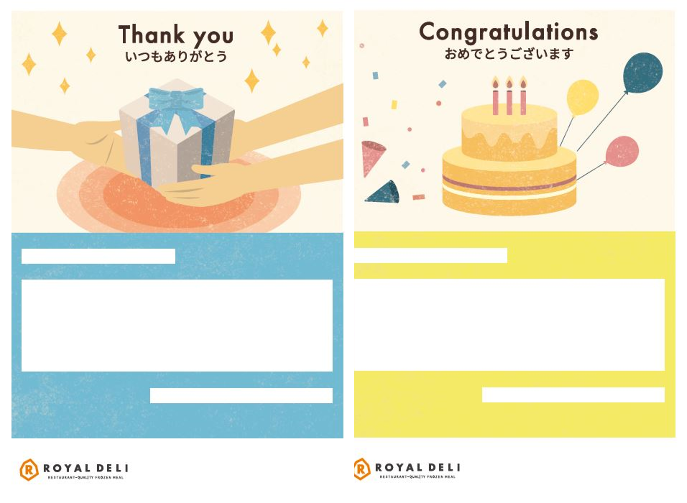 「ロイヤルデリ」は、レストランクオリティ(RESTAURANT-QUALITY)の料理をご家庭で気軽にお楽しみいただけるフローズンミールで、世界各国の料理55品を展開しています。今回の『#時短でおいしい新生活応援セット』では、「クラシック洋食」、「美食の国イタリア」、「アメリカ郷土料理」のカテゴリの中から、電子レンジで温めるだけで作りたてのような美味しさを味わえる商品7種を詰め合わせにした特別セットを期間限定販売。また、新生活を迎える人への贈り物として、応援やお祝いのメッセージが添えられるオリジナルメッセージカードも付いてきます。2種類のデザインからお選びいただくことができ、メッセージの文字は150字程度です。