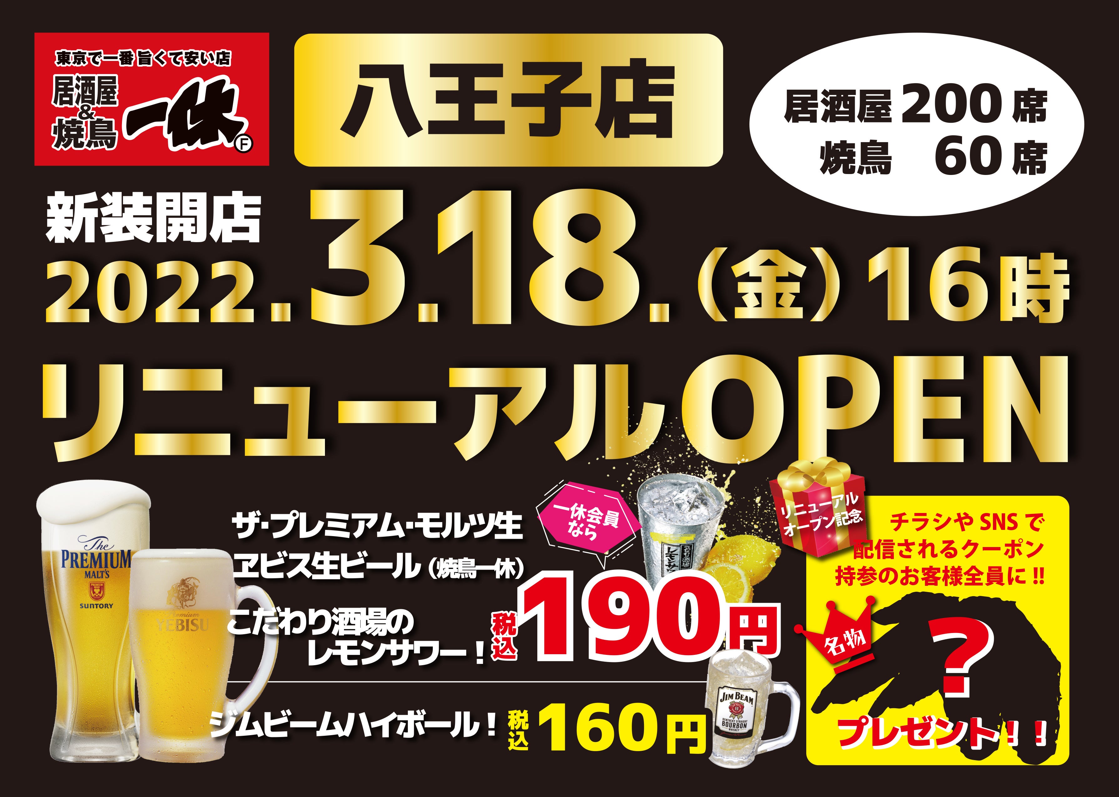 株式会社一休(本社:東京都東村山市、代表取締役:金子清範)は、ジムビームハイボールが160円!ザ・プレミアム・モルツ生ビールが190円で飲める「居酒屋一休 八王子店」を2022年3月18日にリニューアルオープンいたします。1975年創業、高円寺の1号店を始めとする東京と埼玉に居酒屋を展開しております。コロナの影響で2021年は11店舗の閉店を余儀なくされ、規模を縮小しての営業となりました。同年より商品や会員サービスの見直しを図り、今年2022年は一休の肝となるメンバーズカードをアプリと一体化させたデジタル版会員証のサービスや、ドリンクが1杯¥99で飲めるタイムサービスを開始。コロナの終息に向けて、その再スタートなる為の一歩として八王子店を心機一転スタートいたします。若者からサラリーマン世代のお客様にも愛される、昭和感溢れる居酒屋スタイルで「東京で一番旨くて安い」を体験してみてください。皆さまのご来店を心よりお待ちしております。