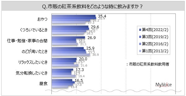 ■紅茶系飲料の飲用場面は「おやつ」が飲用者の約35%、「くつろいでいる」「仕事・勉強・家事の合間」「のどが渇いた」「リラックスしたいとき」が各20%台。2019年調査と比べて「仕事・勉強・家事の合間」が増加