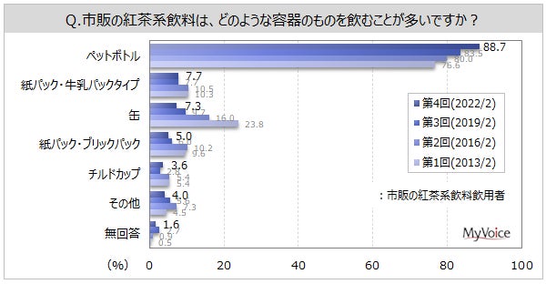 よく飲む紅茶系飲料の容器は(複数回答)、「ペットボトル」が飲用者の88.7%、「紙パック・牛乳パックタイプ」「缶」が7~8%です。過去調査と比べて、「缶」は減少しています。「紙パック・牛乳パックタイプ」は若年層で高い傾向です。