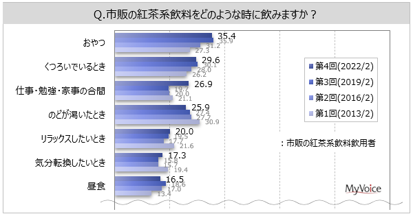 ■紅茶系飲料の飲用場面は「おやつ」が飲用者の約35%、「くつろいでいる」「仕事・勉強・家事の合間」「のどが渇いた」「リラックスしたいとき」が各20%台。2019年調査と比べて「仕事・勉強・家事の合間」が増加