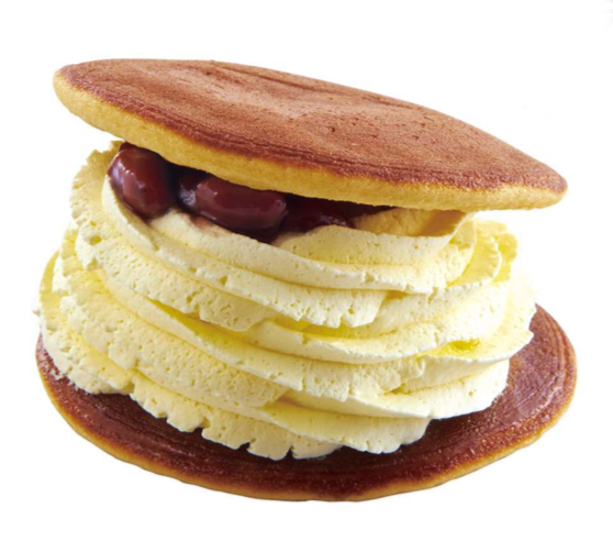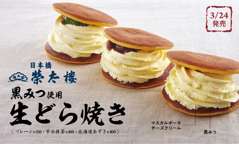 『④黒みつ生どら焼き プレーン 350円』 程よい甘さのどら焼き生地に榮太樓總本鋪こだわりの沖縄県小浜島の黒糖を100%使用したコク深い黒みつをたっぷりと染み込ませ、すっきりとした甘さの マスカルポーネ入りのホイップクリームをたっぷりサンドしました。他にも北海道産ゆであずきを使用した 『⑤黒みつ生どら焼き 北海道あずき 400円』 や、深みある上品な旨味とすっきりとした渋みのバランスが良い濃厚な宇治抹茶クリームを使用した 『⑥黒みつ生どら焼き 宇治抹茶400円』をご用意しています。テイクアウトもご用意していますので、ぜひ一度お召し上がりください!