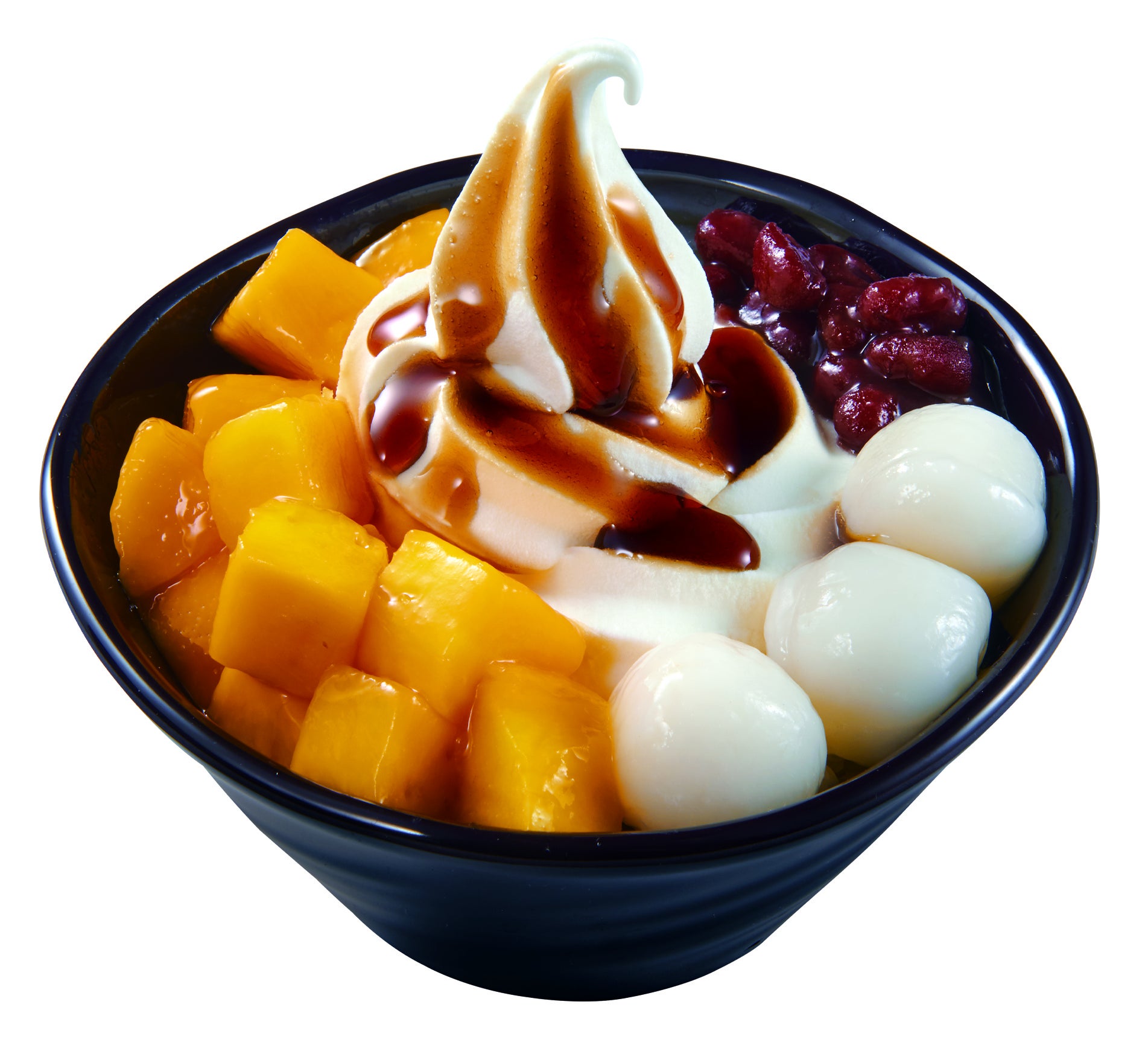 ①たっぷりマンゴーの 黒みつクリームぜんざい 550円
