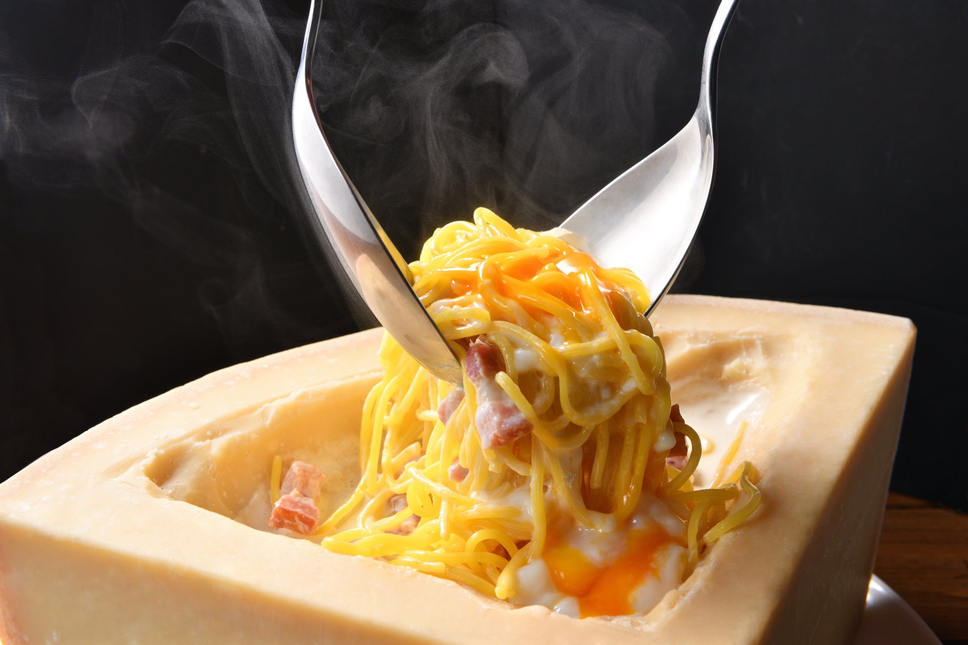 新名物のライブ感満載のパスタ。長期熟成パルマチーズの中で熱々のカルボナーラを大胆に絡めて仕上げる新感覚のカルボナーラです。半熟卵をとろ~りと割って贅沢に召し上がれ!