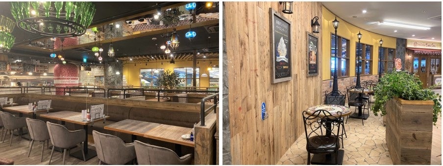 店内にはソファ席をメインに92席ご用意しており、ワインボトルで作られたシャンデリアやイタリアを感じさせる色鮮やかな照明の数々があたたかい空間を演出します。お子様連れでも安心してご来店いただけるよう、キッズスペースなどファミリーにも優しい環境を整えており、屋内に設けられたテラス席はペット同伴でご利用いただくことができます。