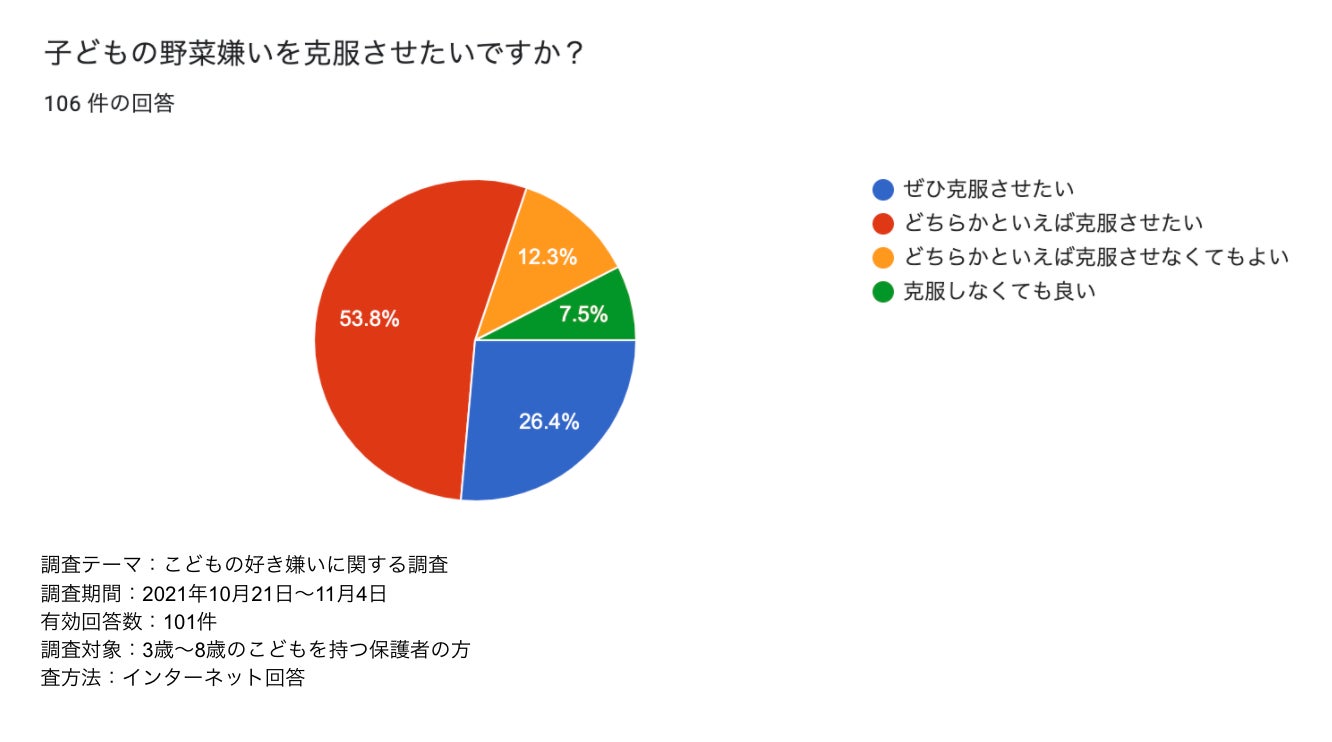 実際に3歳〜8歳の子どもを持つ保護者の方101名にアンケートを取ったところ、約8割の方が子どもの野菜嫌いを克服させたいと考えていることが分かりました。