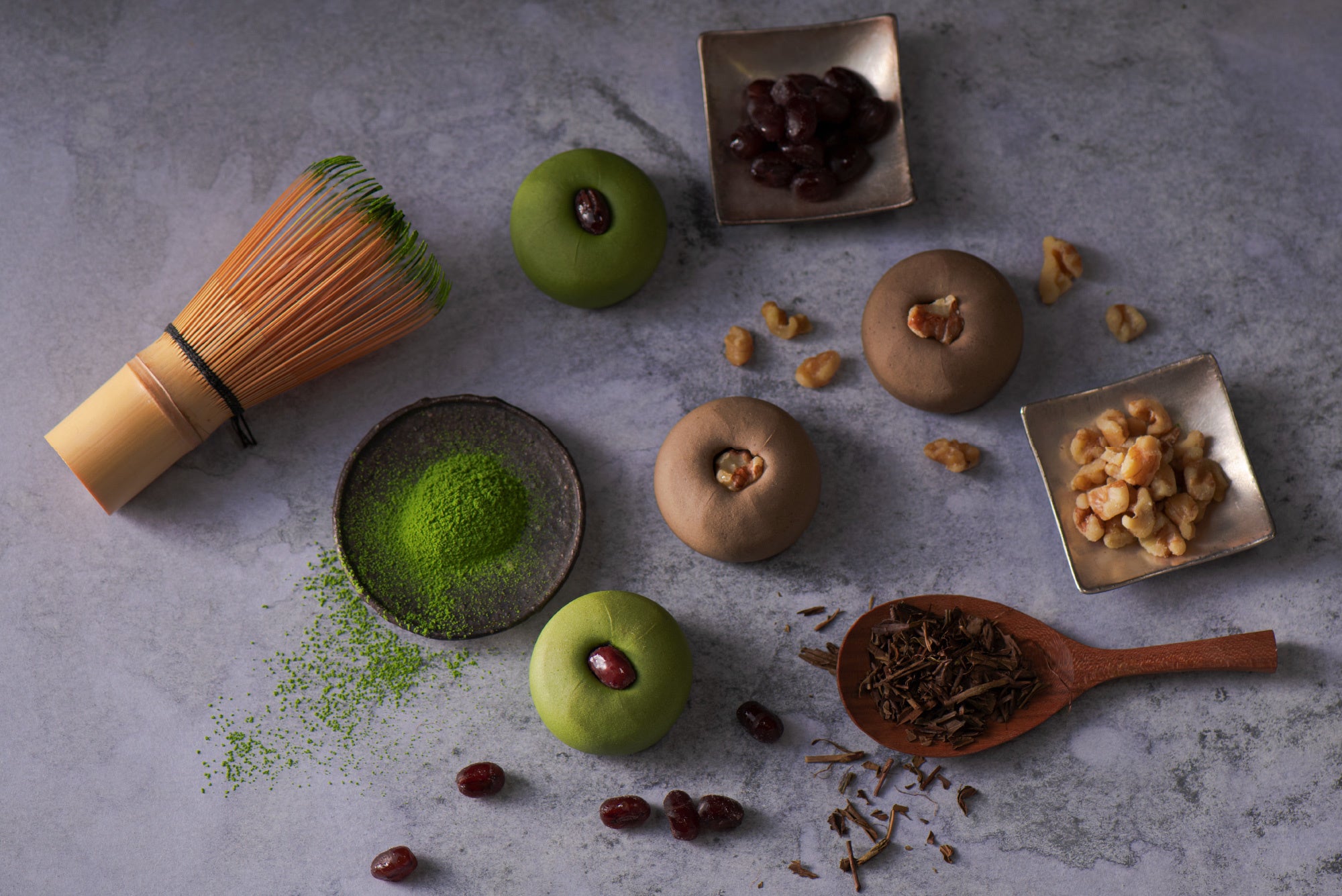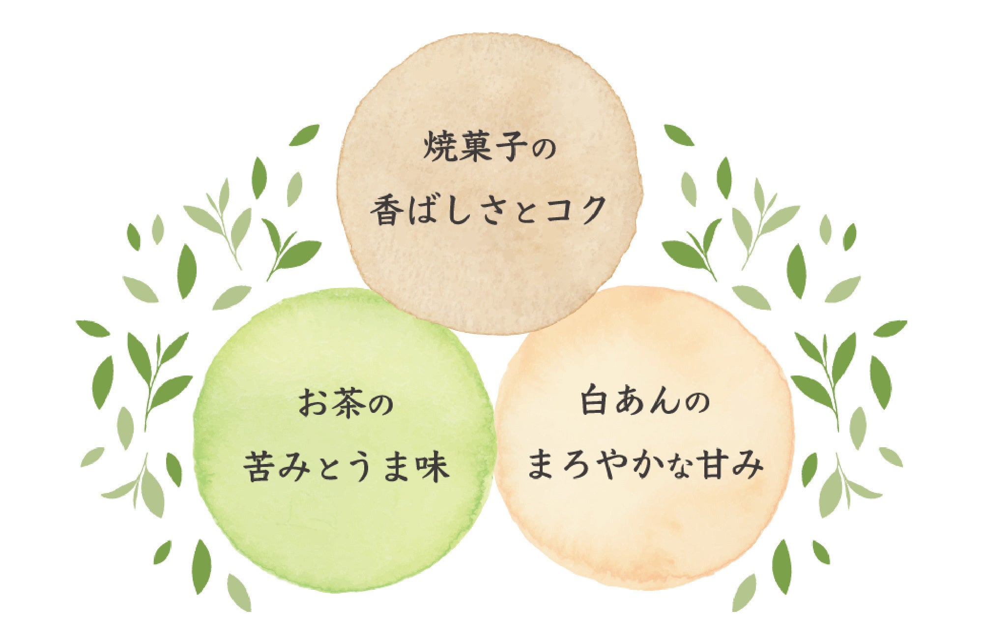 使用するのは、茶師厳選の「お抹茶」と「ほうじ茶」。それぞれを練り込んだ生地でまろやかな白あんを包み、ころんと可愛く焼き上げました。抹茶には小倉を、ほうじ茶にはクルミを乗せて、食感と風味のアクセントに。白あんはお茶の味を引き立て、全体が調和するよう、あっさりとなめらかな舌ざわりと甘みに炊き上げました。