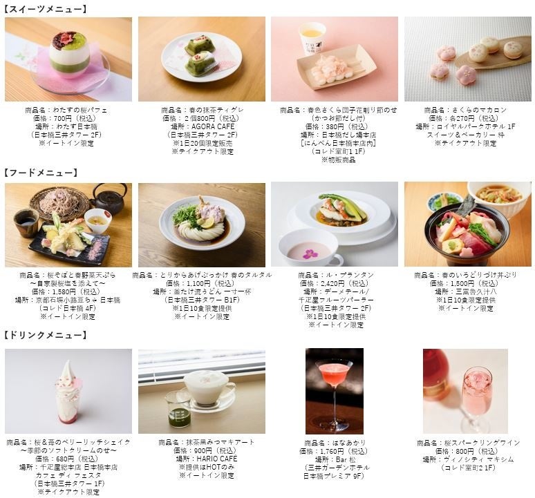 日本橋エリアの約200店舗が“桜”をテーマにしたこの春限定のメニューを展開します。心も満たすスイーツから、お弁当、軽食、グッズまで、見ても楽しい、味わっても楽しい春の品々が揃いました。