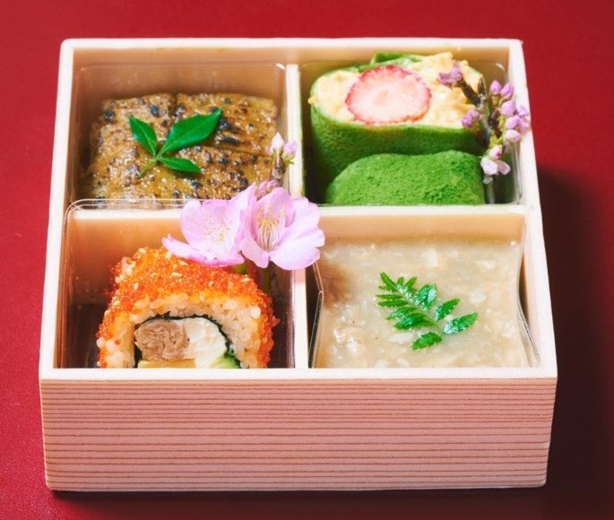 植物肉を使った鰻や巻き寿司、コオロギエキスを使った茶碗蒸し、野菜のパウダーを使ったデザートなど、次世代食材を用いて各店の人気メニューを表現する料理人たちのアイデアが詰まったお弁当をお楽しみください。