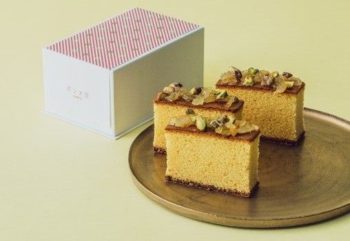 日本橋江戸桜通りを拠点とするカステラの老舗・文明堂東京と、人気のカジュアルフレンチLa Bonne Tableのコラボから生まれた“洋生カステラ ボンヌ堂”。文明堂東京の看板商品であり、卵黄卵白の重量比率5:3の濃厚な味わいを持つ特撰五三カステラと、ピスタチオの食感とカルダモンの香りが爽やかな柚子のコンフィチュールがマリアージュ。